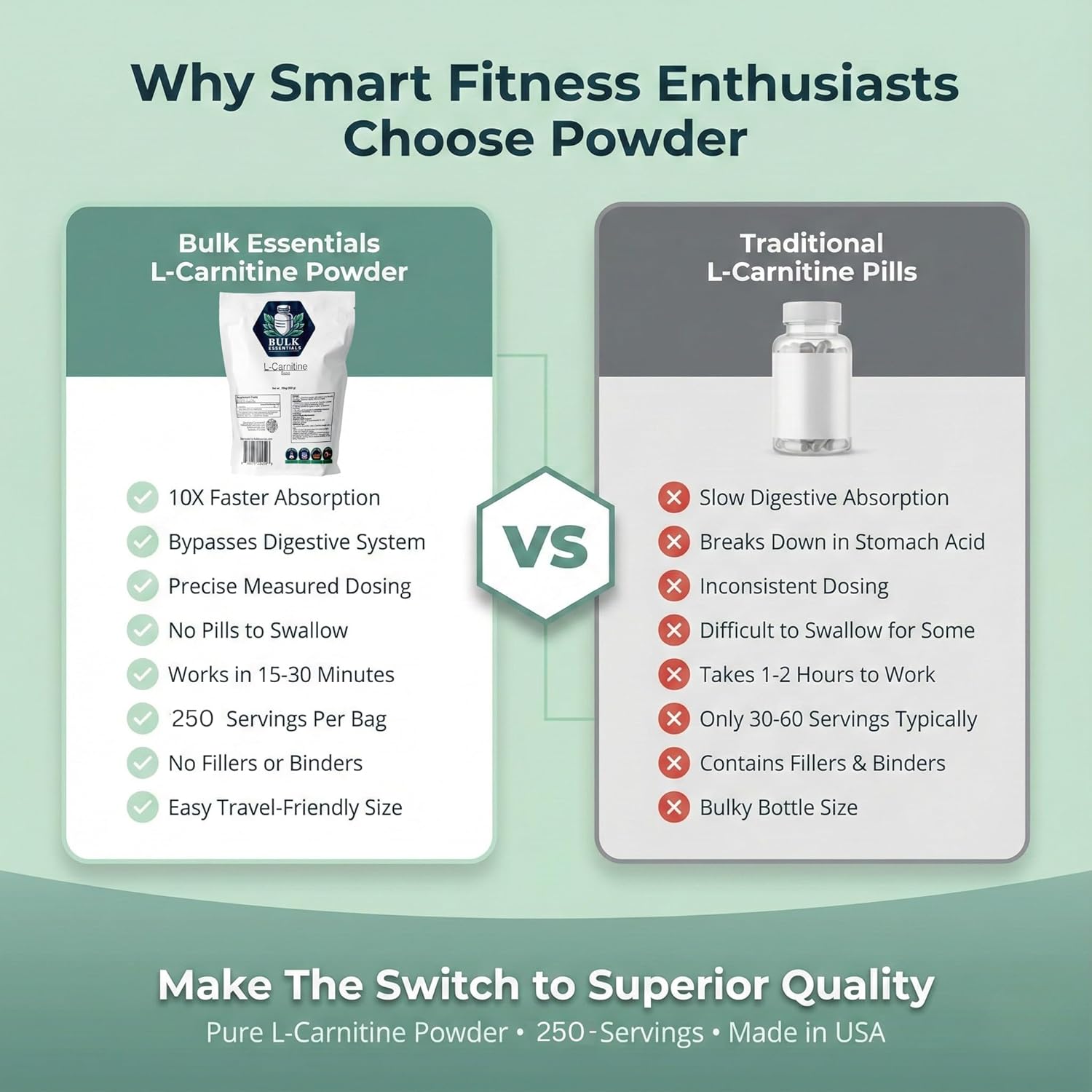 Bulk Essentials L-Carnitine Powder is fast-dissolving supplement designed to support energy metabolism, endurance, and cardiovascular health. L-Carnitine plays a vital role in transporting fatty acids into energy, making it an excellent addition to any active lifestyle. Whether you're an athlete, fitness enthusiast, or simply looking to maintain overall wellness, our L-Carnitine powder helps support exercise performance and recovery.Made with purity in mind, this unflavored, non-GMO, and gluten-free powder blends seamlessly into water, juice, or smoothies for easy daily supplementation. Manufactured under strict quality standards, Bulk Essentials ensures a clean and effective formula free from artificial additives. Packaged to maintain freshness, our L-Carnitine powder supports those looking to optimize energy levels and cardiovascular function naturally.How to UseMeasure the desired amount using a precise scale or measuring device.Mix with water, juice, or a preferred beverage and stir well until dissolved.Consume immediately for best results.Recommended DosageGeneral Wellness – Take 1g (1/4 scoop) once daily.Active Support – Take 1g twice daily or as recommended by your healthcare provider