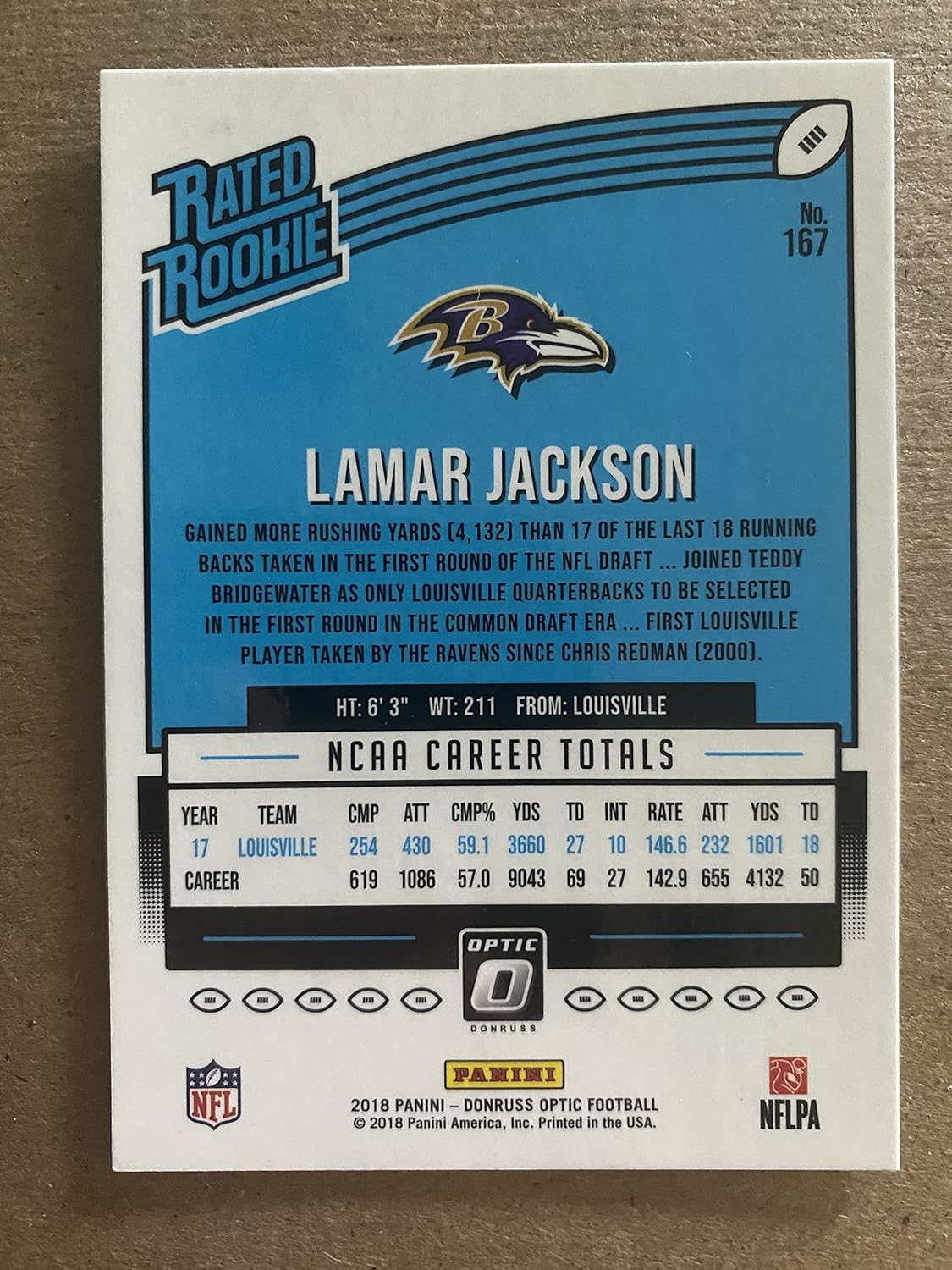 Lamarr Jackson 2018 Opic Rated Rookie SP Donruss #167 Pack Fresh Officially Licenced NFL Football Trading Card. The images depict the card (front and back) that is included. The card will be packaged very safe and securely during shipping. Each card will be in a brand new sleeve and brand new top loader.