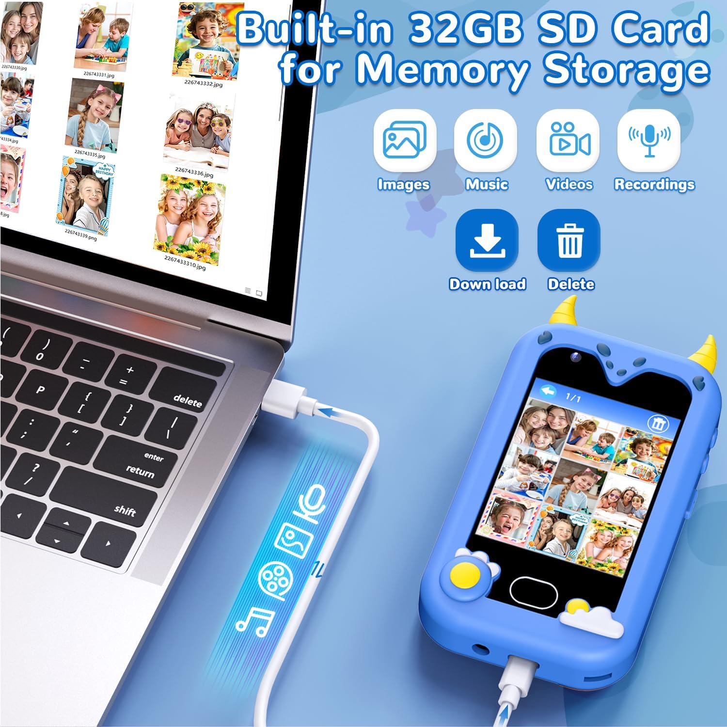 | Included Components | 1* Toy Phone, 1* Cute Dinosaur Phone Case, 1* Product Manual, 1* Type-C Data Cable, 1* 32GB SD Card,1*Lanyard |