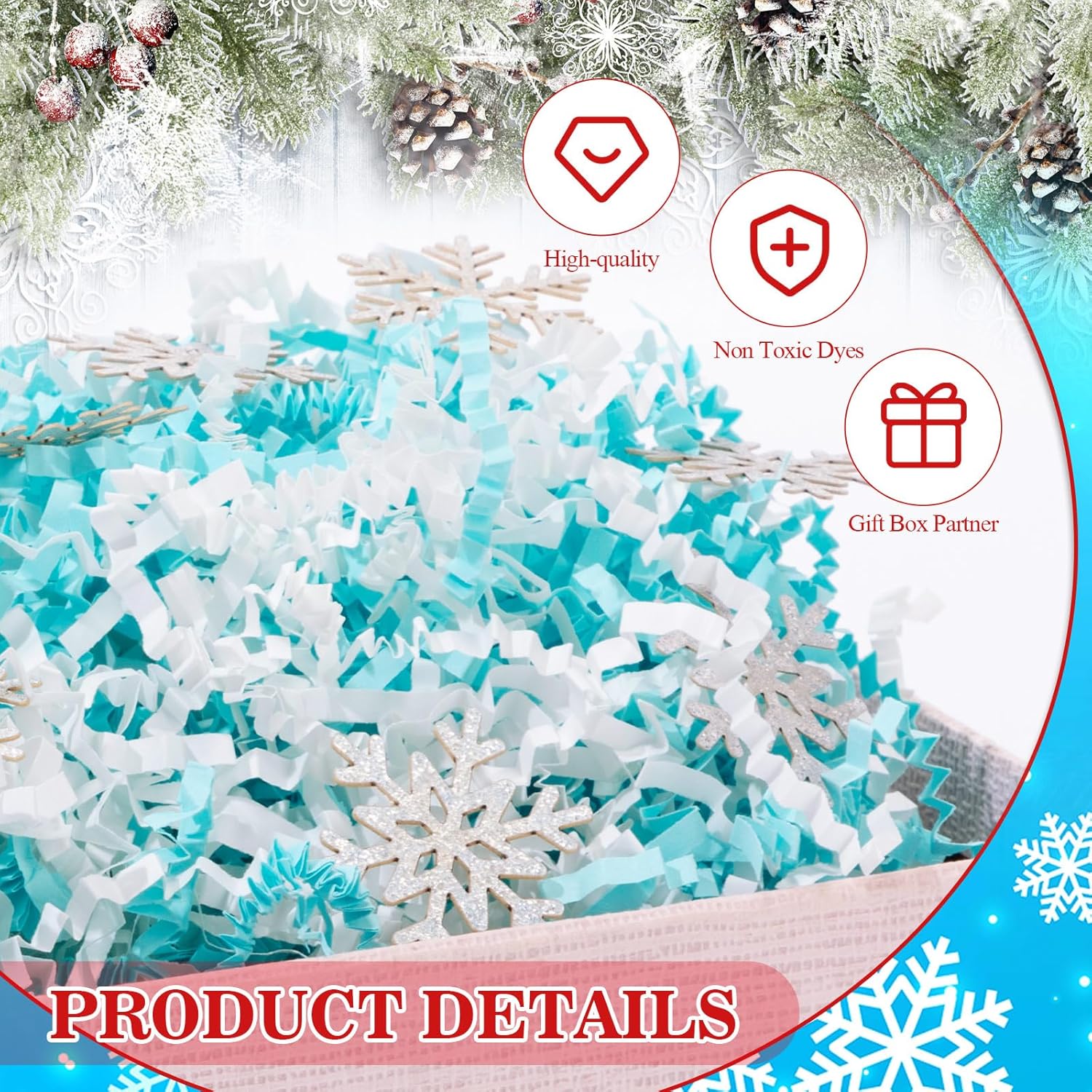 | Included Components | Crinkle Paper, Snowflake Confetti, Raffia Grass, Tissue Paper |