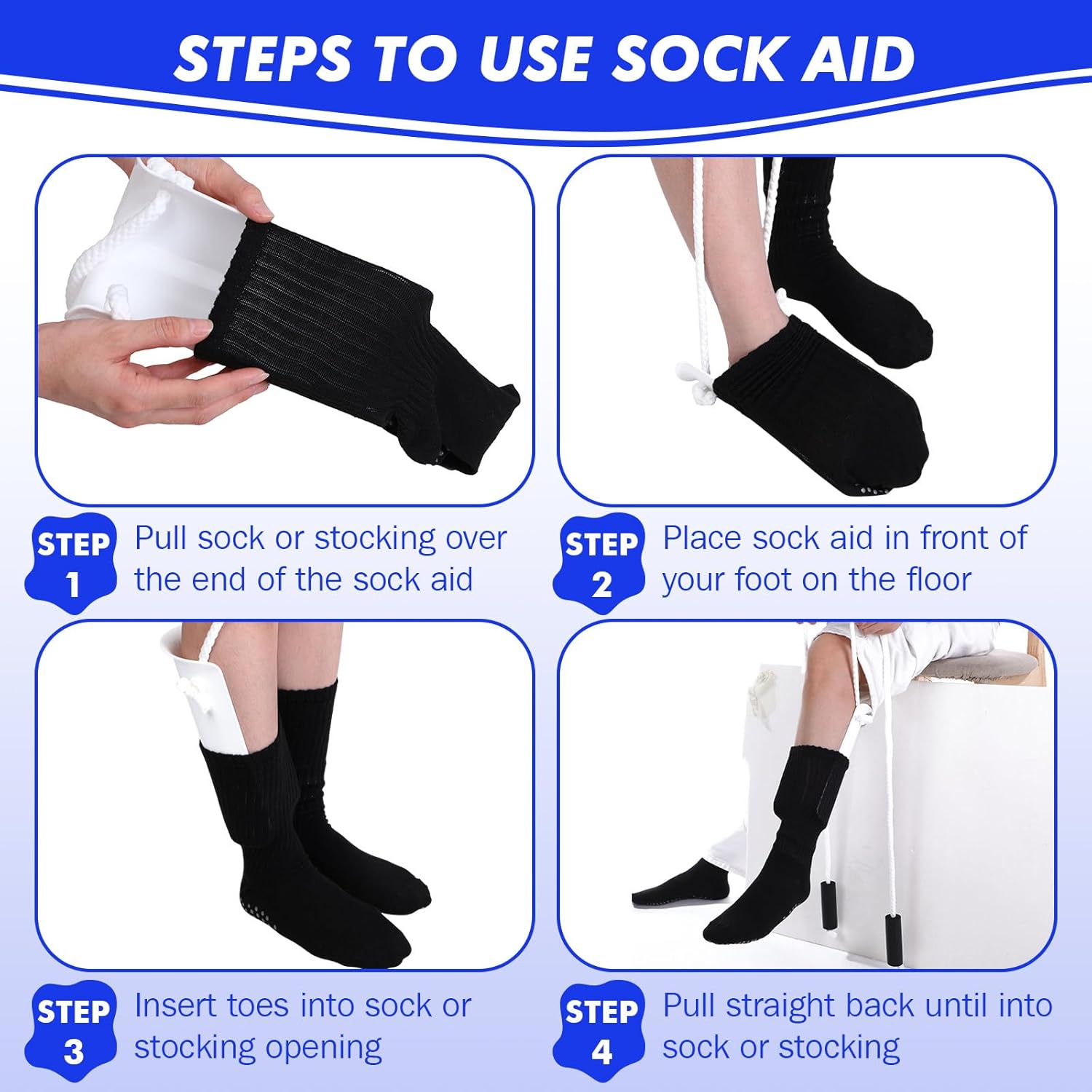 Features: Note: This product is not suitable for use with compression or stretch stockings. Recommended regular sock types: ankle socks, flat socks, knee socks, calf socks, athletic socks, dress socks, etc. Suitable for feet 5 inches wide or less. Specifications: Material: plastic, polyester Color: white Size: as shown in the figure Package includes: 4 X sock aid Notes: Manual measurement, please allow slight errors on size. The color may exist a slight difference due to different screen displays