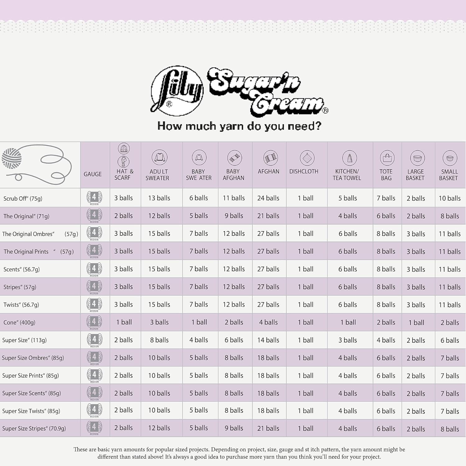Lily Sugar 'n Cream Cotton Cones yarn is 100% USA Grown cotton yarn. Sugar 'n Cream is a versatile worsted weight yarn, that’s great for small projects like dishcloths and potholders, to home décor staples like afghans! Available in a wide variety of shades, including neutrals, brights, and pastels. Conveniently machine washable and dryable for easy care.