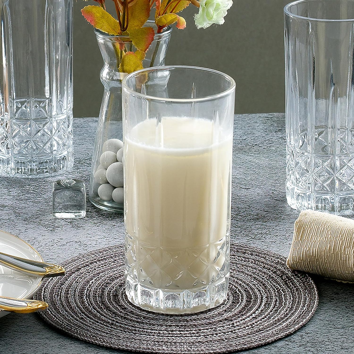Lorren Home Trends Tall 12 Ounce Drinking Glass-Textured Cut Glass, Set of 6. Glassware for Drinking Water, Beer, Soda, Milk, Juice, Cocktails, and any Spirited drink. Dishwasher safe. Complete set of 6. Nice grip and well balanced feel to this glass. Lead Free glass, great for every day use. Elegant cut and engraved glass can dress up your table and enhance your drinks with a high end look.