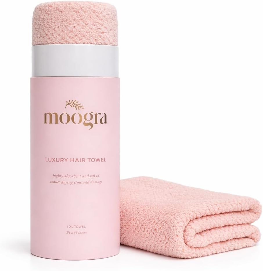 QUICK DRY MICROFIBER HAIR TOWELUpgrade your routine with the Moogra Microfiber Hair Towel Wrap, made from soft, ultra-absorbent microfiber that dries hair faster while helping reduce frizz and heat damage. It quickly pulls excess moisture from your hair, leaving it smoother and healthier with less blow-drying.The large 48" × 24" size offers full coverage for short, long, thick, or curly hair, giving you a comfortable wrap every time. The reinforced elastic loop keeps the towel secure during skincare, workouts, or while getting ready with no slipping or readjusting.Gentle on all hair types, the low-friction microfiber helps minimize breakage and split ends. Lightweight, compact, and machine washable, it’s perfect for home, gym bags, pool days, and travel. A reliable, quick-dry towel that stays soft and absorbent wash after wash.