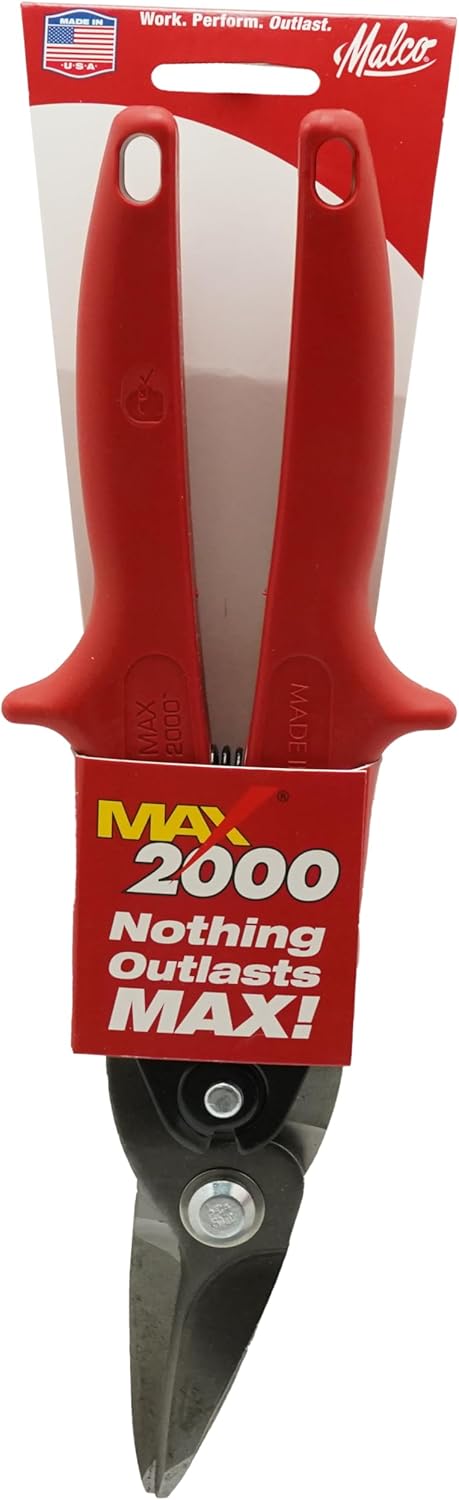 Product Description Malco Max2000 left cutting Aviation Snips features Euro-styled ergonomic handles and superior hardened blade edges for maximum cutting life. Textured, solid-colored, molded thermoplastic grips and finger stops compliment a narrower handle opening to fit large or small hands. An ambidextrous, thumb-operated handle latch and replaceable compression spring complete this user-friendly design. Riveted, head-to-handle compound linkage multiplies hand leverage applied by user. Linkage will not rattle or loosen ever! And an easily adjustable pivot bolt, with nylon locking nut, holds its adjustment securely for these hard-working aviation snips. From the Manufacturer Aviation style metal snip (red grip) for straight cuts and curved cuts to the left. Hardened alloy steel blades offer maximum cutting life. Superior material flow allows maximum maneuverability. Ergonomic handles maximize length of cut and hand's natural power stroke.
