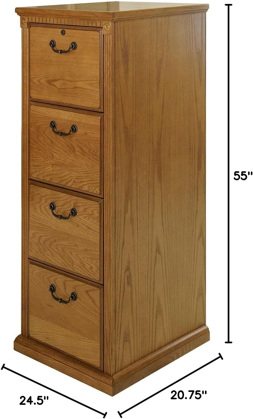 The Huntington Oxford office collection boasts a transitional furniture design built with hardwood solids and veneers. It is available in a traditional oak finish or warm burnish brown finish. The Huntington Oxford collection incorporates a highly detailed finish with hand-applied distressing that includes rasping, wear sanding, dry brushing and pin holes to create texture and depth. This delivers a unique, special worn appearance of fine furniture that has withstood the test of time. The natural grain and beauty of the wood is enhanced by a multi-step, hand rubbed finish. Vertical fluting and dentil molding further add character and aesthetic appeal. The file cabinet features four letter/legal sized file drawers for storage, and the top drawer locks for security. Ships fully assembled with 5 Year manufacturer warranty.