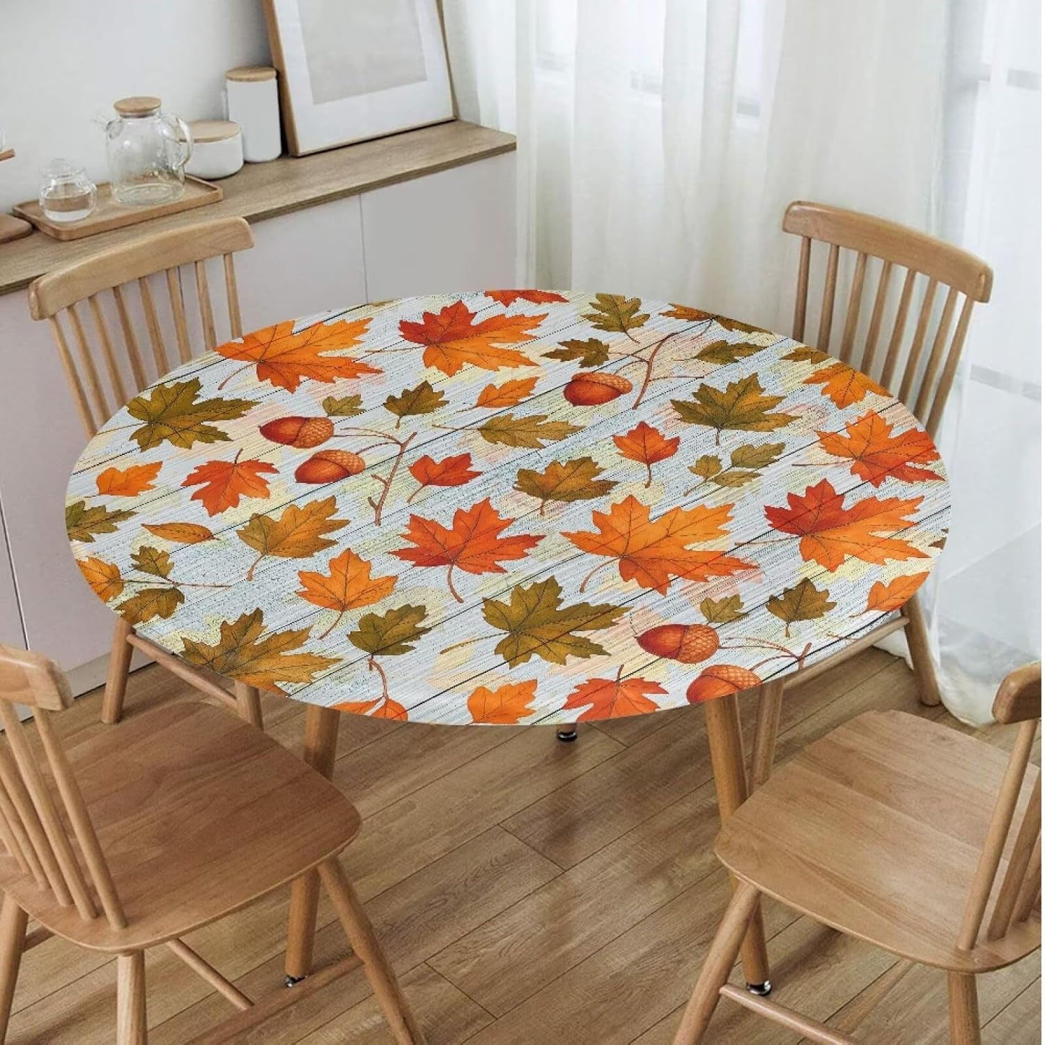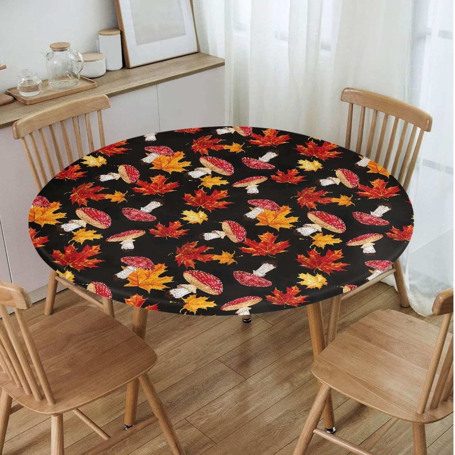 Stretch Round Fitted Tablecloth for Indoor and OutdoorCover only Material: This round table cover is made of waterproof polyester fabric which is Lightweight and easy to clean. Size : There are two sizes to choose: The Small Size fits 39.4-51.2 inch table, The Large size fits 55-63 inch table. In here you can find a tablecloth that suits your desk. The sizes have been shown in the detailed pictures, please read carefully before purchase. Elastic Edge Design: The round tablecloth with elastic edge can be set on the table and will not move as easily as ordinary tablecloths. This table cover material is elastic and smooth to touch. Protect your dinner table from scratching, spilling and staining. Water resistant makes it easy to clean and tidy, it can be wiped with a damp cloth. Suitable for Many Occasions: This table cover can be used in various occasions, such as home, dining room, holiday, Thanksgiving Banquet, Christmas Party, wedding, birthday, restaurant, party, banquet, picnic, or any indoor and outdoor activities. This fitted table cover looks tidy, clean, comfortable and easy to care for. It could add atmosphere to your lovely table and make you feel relaxed.