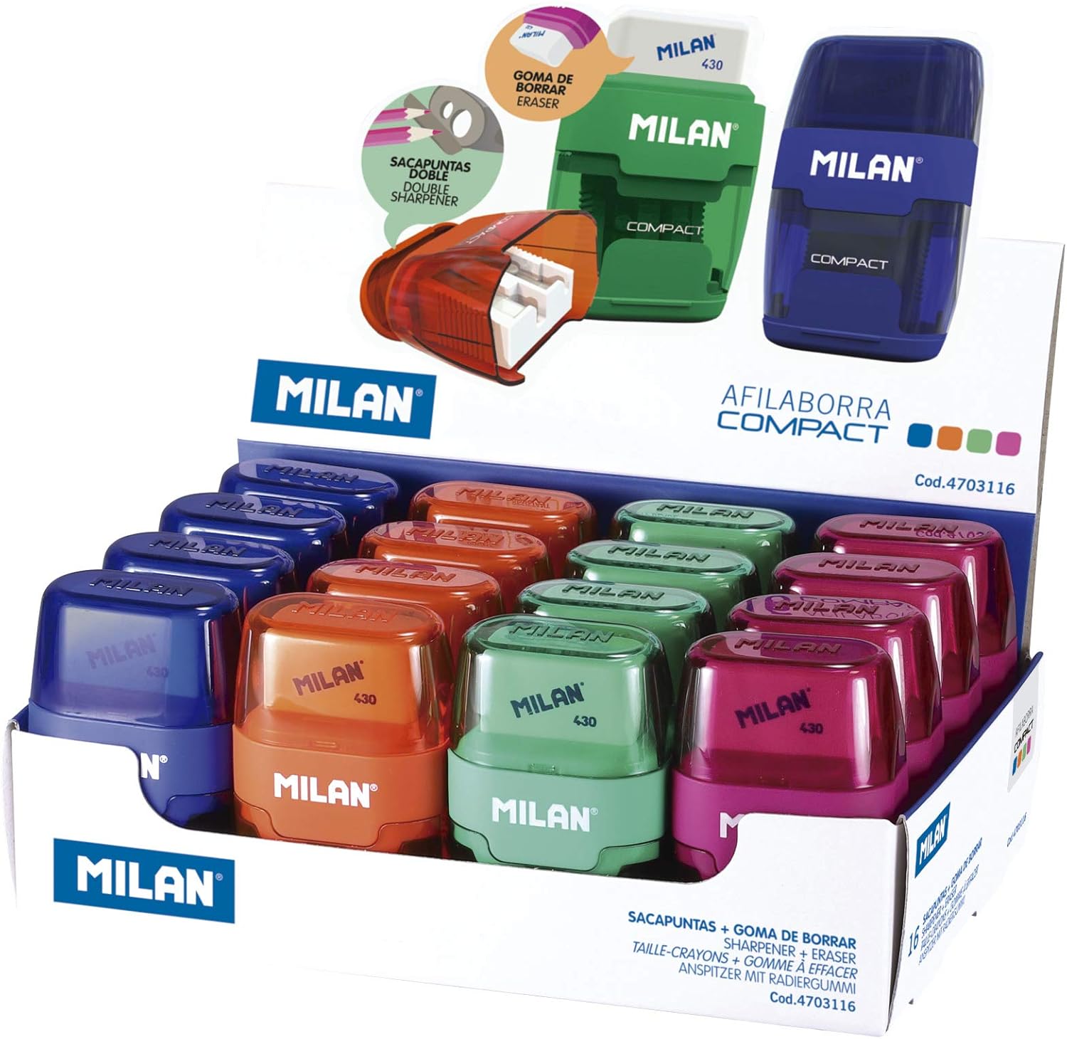 Compact Sharpener-Eraser, 2 hole sharpener, cardboard container display, containing 16-piece. Soft synthetic rubber eraser and sharpener suitable for use with a wide range of graphite and color pencils.