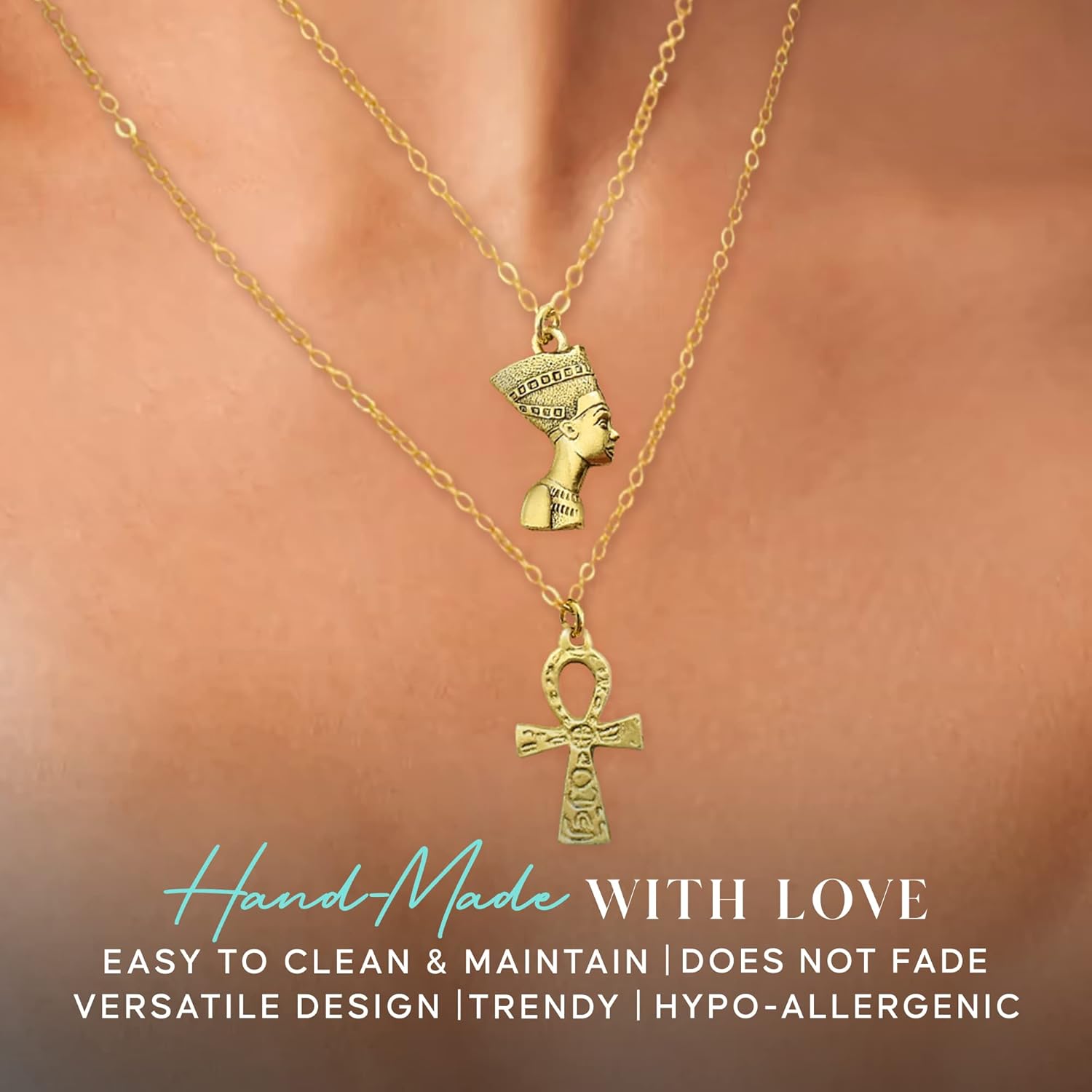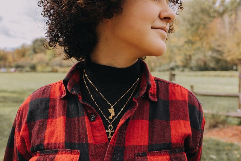 Layering Nefertiti and Ankh NecklacesLayering Necklace Set with two necklaces paired together for you or someone special. Nefertiti charm necklace in 24K gold plated pewter on an 18 inch gold toned stainless steel cable chain with 2 inch extender. Ankh charm necklace in 24K gold plated pewter on a 20 inch gold toned stainless steel cable chain with 2 inch extender. This will arrive in a beautiful turquoise gift box with a silver elastic ribbon. High-Quality Charms JewelryThese are high-quality charms, made in the United States and are lead-free. Stainless Steel chains make great durable, strong jewelry. It doesn't tarnish or rust. Also, it is a great choice for anyone with skin allergies. Fabulous GiftThis is definitely a keepsake piece of jewelry. If you're looking for a fabulous gift for your favorite friend, wouldn't she love to wear this Charm necklace.●Handcrafted in our studio in Upstate NY●Perfect gift for Birthday, Christmas, or Just Because.●Materials and Finish: Stainless Steel; Gold Plated Pewter●100% happiness guaranteeMeasurements Nefertiti charm: 24mm X 16mm- Double-Sided Ahnk charm: 27mm X 16mm -2-Sided