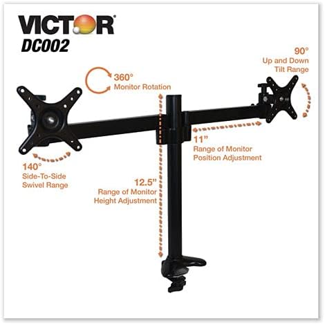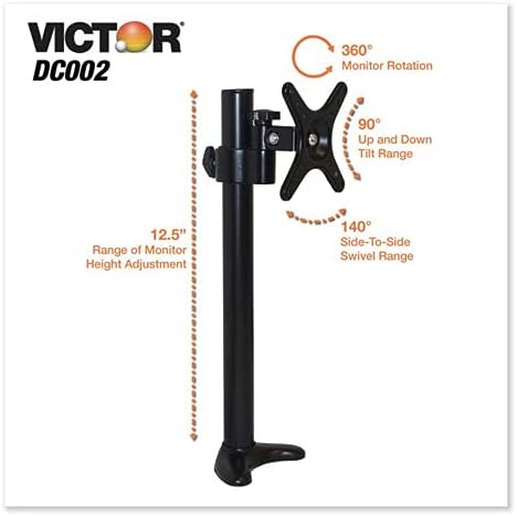 The Victor DC002 Monitor Mount optimizes the space of any traditional or standing desk by freeing up the work surface allowing more room for other items. The 16.5” tall monitor mount is adjustable with a range of 12.5” that allows for correct ergonomic placement of the monitor(s). Not only is having monitors at the correct ergonomic height more comfortable, but it also alleviates strain on the neck and eyes. The DC002 offers components for both single and dual monitor applications. The Monitor Mount attaches to any desk of 1-inch thickness or less by through-hole (grommet) or clamp attachment components. Both attachment components are included. The sturdy aluminum stand supports one monitor of any size up to 15 lbs or two monitors up to 23” wide and up to 15 lbs each. The Tilt and Swivel function creates a broad range of motion for the monitor(s). A single monitor has a tilt range of 45° and a pan range of 225°. When using two monitors, there is a tilt range of 45° and a pan range of 180°. The DC002 can be attached to any work surface by mounting hole or clamp. Compatible with Varidesk, Flexispot, Victor, and many other standing desk converters. Standard VESA mounting holes on monitor are required.