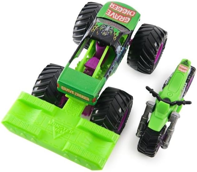 Get ready for epic monster truck action with this Monster Jam Grave Digger set featuring both a die-cast monster truck and matching dirt bike! The iconic green and purple color scheme brings the legendary Grave Digger to life in impressive detail. The monster truck boasts massive purple wheels, detailed chassis work, and authentic Monster Jam styling. The included dirt bike perfectly complements the truck with matching colors and rugged off-road design. This set comes complete with a display ramp that showcases both vehicles in style. Perfect for Monster Jam fans and collectors, these die-cast vehicles are built tough for hours of imaginative play. The set makes an excellent addition to any toy vehicle collection, allowing kids to recreate their favorite Monster Jam stunts and adventures at home. Not suitable for children under 3 years due to small parts.