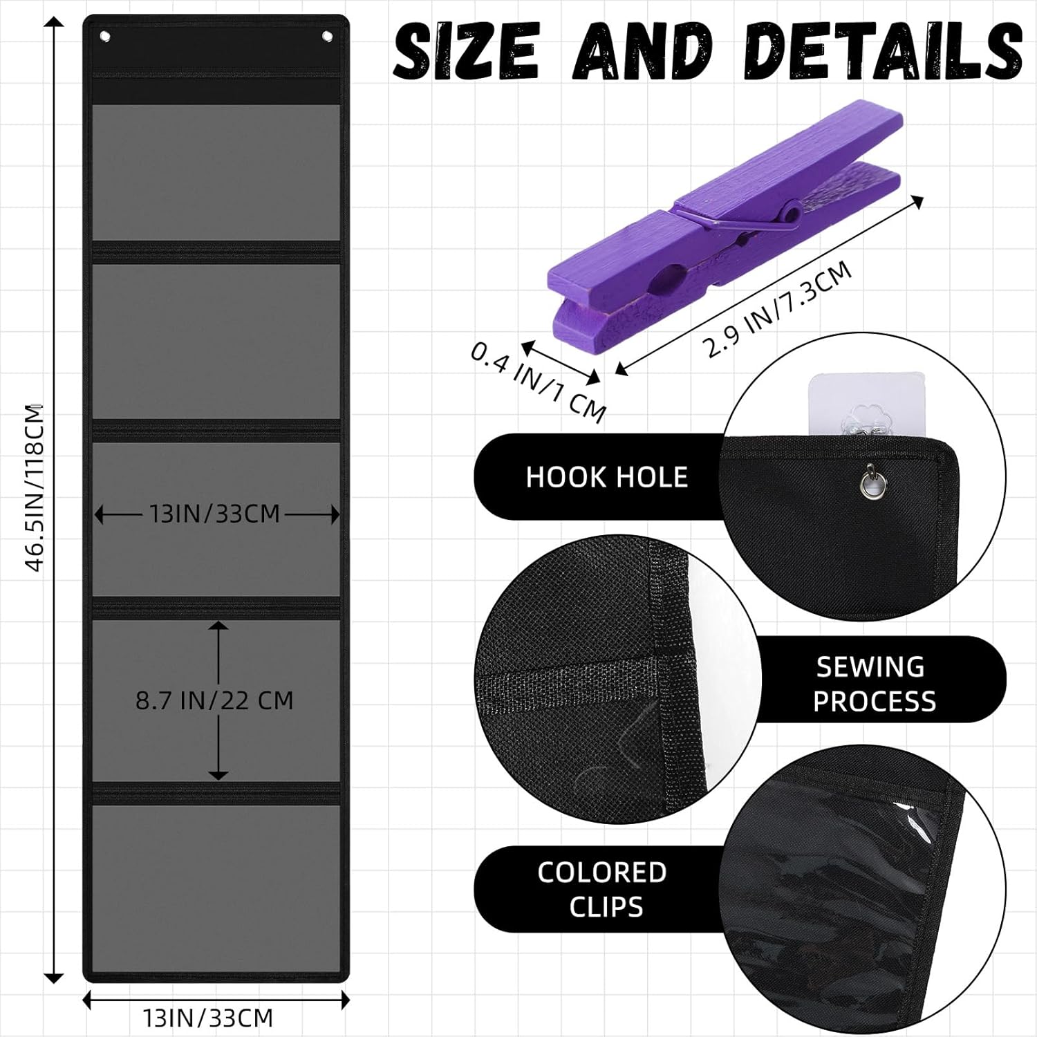Features: Convenient and practical design: Our pocket charts unfold to a compact size of 37.4 x 13 inches, making them easy to hang and store. Their practical structure allows for quick setup and takedown, ensuring seamless integration into any classroom setting. Vibrant organizational clips: The package includes 24 multicolor wooden clips, each measuring 2.87 x 0.39 inches, adding a splash of color to your organization. These clips are ideal for categorizing and securing items on the behavior chart while enhancing visual engagement. Specifications: Material: oxford cloth, PVC, wood Color: Behavior chart: black Wooden Clips: as shown Size: Classroom behavior chart: 37.4 x 13 inches/95 x 33 cm(unfolded) Pocket: 8.7 x 13 inches/22 x 33 cm Wooden clips: 2.87 x 0.39 inches/ 73 x 10 mm Package includes: 4 x Classroom pocket charts 48 x Colorful wooden clips Notes: Manual measurement, please allow slight errors on size. The color may exist a slight difference due to different screen displays