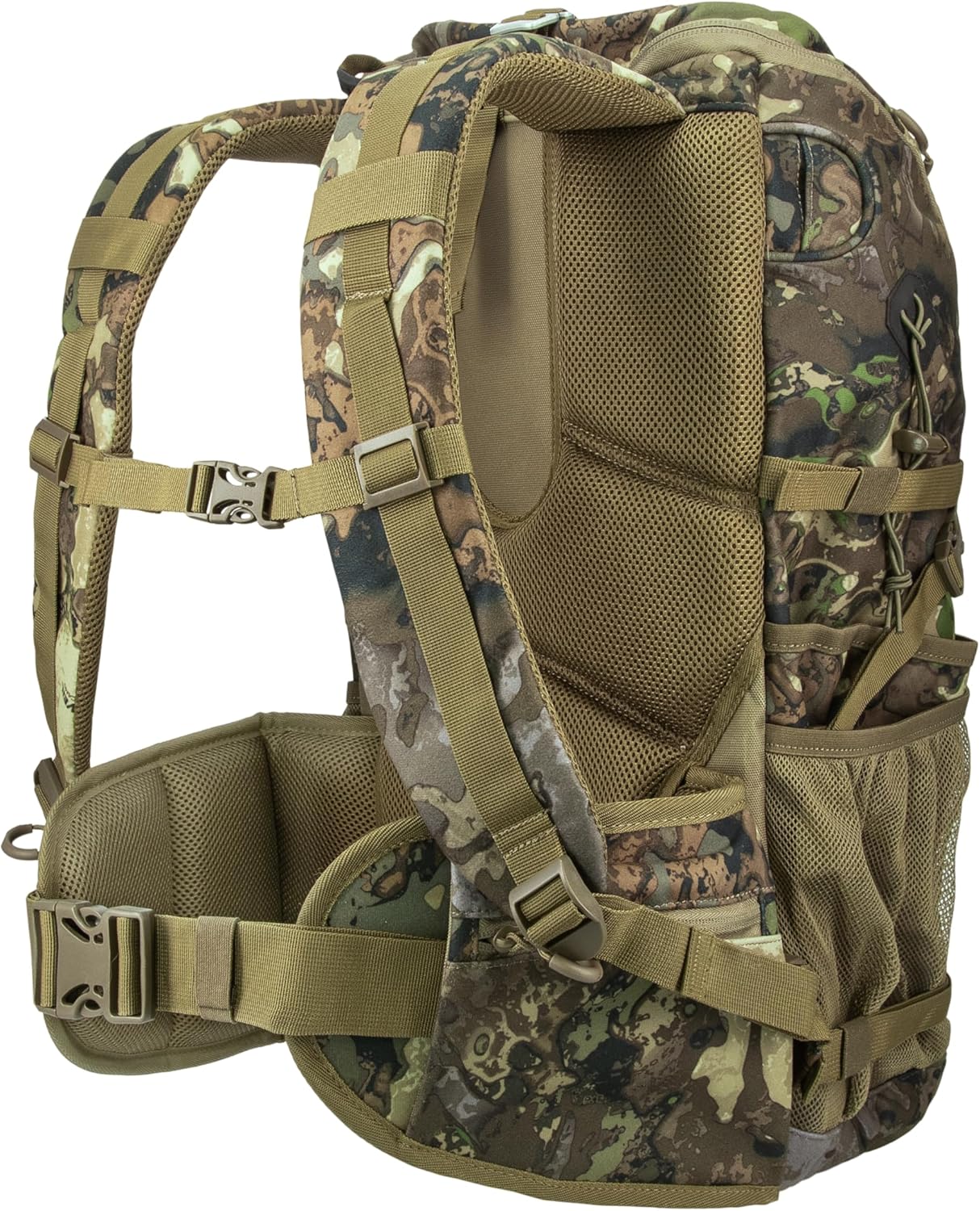 This pack comes with a brown rain cover for weather protection and a zipperless lid design for quiet access to your gear. The large main compartment offers ample storage, while an interior mesh pocket helps keep your gear organized. Two fabric and mesh side pockets provide additional storage options, and the two-piece adjustable, removable waist belt ensures a comfortable fit. It also features two waist belt pockets with silent zippers for easy access to essentials. Dual accessory side straps allow you to securely carry gear and weapons. The flip-down lid with pockets provides convenient access when you're in the stand or blind. With chest and waist straps for added support, this pack is made from 100% poly brush, offering a soft, durable, and quiet material perfect for outdoor use.