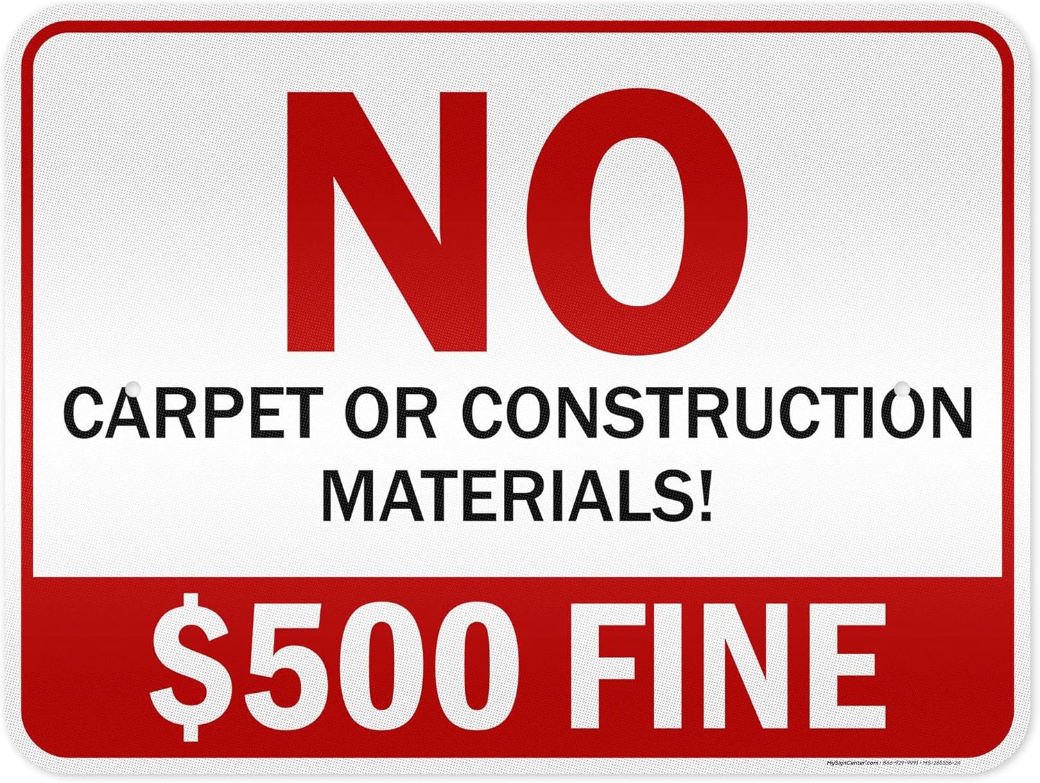 No Carpet Or Construction Materials $500 Fine Sign, 12x18 Inches, 55 mil thick HDPS (high density polystyrene), Made in USA by My Sign Center
