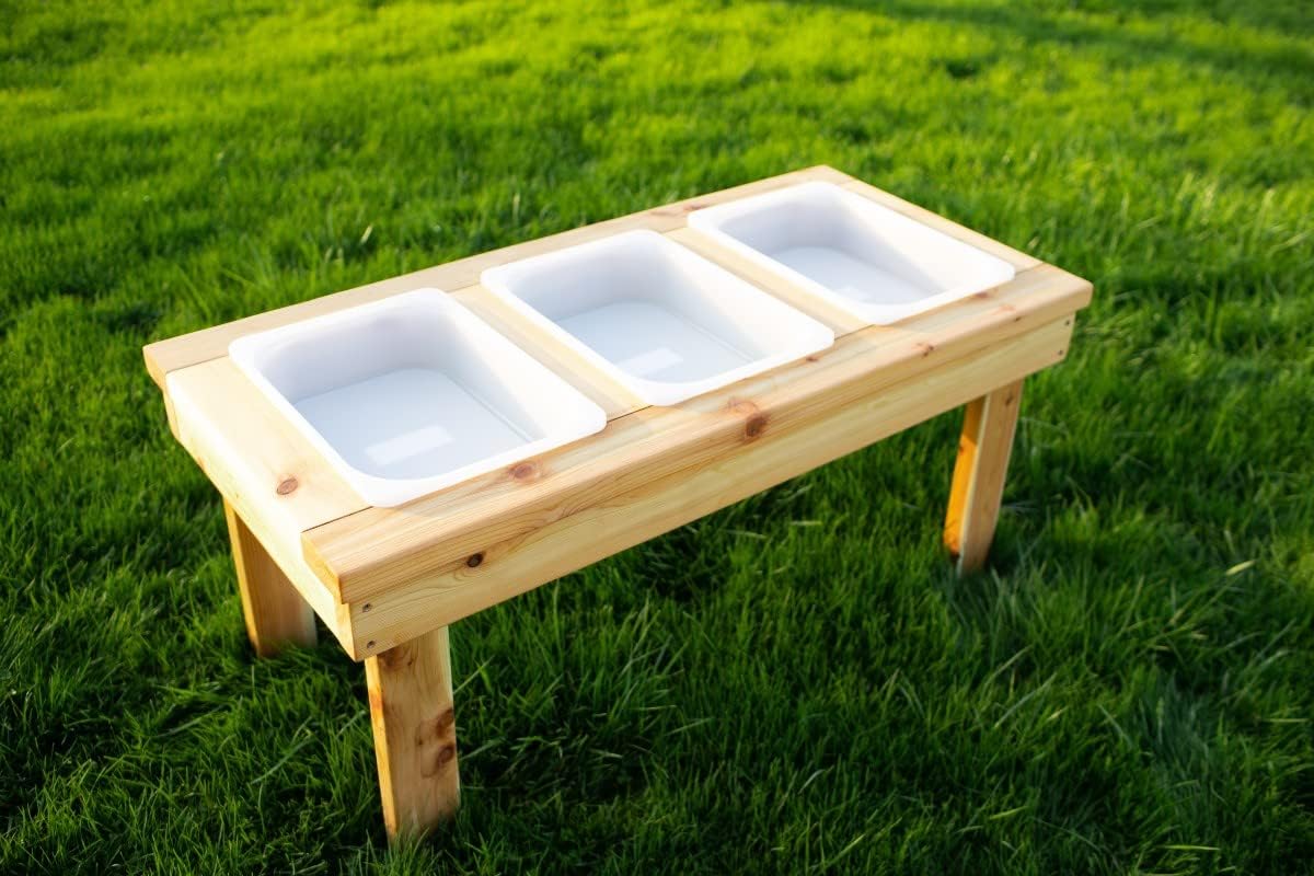 This sensory table is handmade in Ontario, Canada using 100% Cedar - the best wood for outdoor use that will hold up for years outdoors. It has been finished with a non-toxic child-safe UV ray protectant. Includes 3 plastic bins (lids not included) and all hardware needed for assembly other than a #2 square screwdriver (driver bit provided). *Sensory fillers not included with purchase. Outdoor sensory tables just make sense - no more mess inside your house, children are free to get as creative and messy as they want without having to worry about clean up! This large sensory table is perfect for Montessori daycares, preschools, siblings or just parents who have lots of different ideas for sensory activities for your little one! There are ENDLESS options for items you can fill in your bins! You can get creative and make your own sensory activities such as: kinetic sand, dried rice, beans, corn, sand, buttons, shaving cream, etc. Children learn through their senses - exploring different textures improves fine motor skills and helps encourage children to explore the world around them. DIMENSIONS AND TABLE HEIGHT OPTIONS: Each table is 45.5" L x 22.25" D x 21" H.