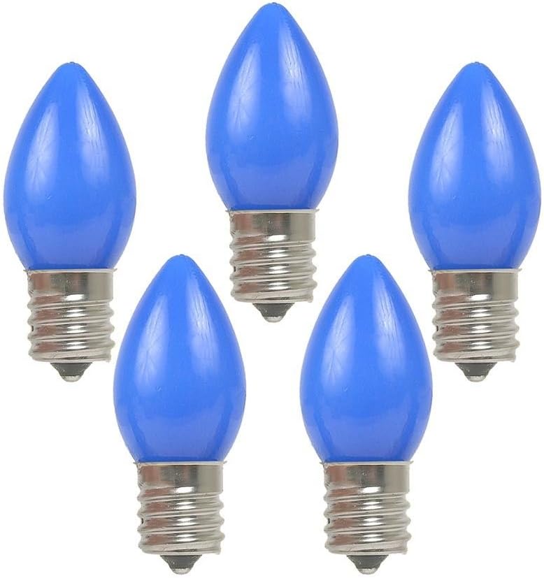 Dive into the holiday mood with our Blue C7 Ceramic-Style LED Christmas bulbs, an ideal enhancement to your festive decorations. Whether it's your patio, Christmas tree, or poolside tiki bar, these LED C7 Christmas light bulbs bring a lively touch to any environment. Experience the economical advantages of our C7 LED holiday replacement bulbs, engineered to consume less than 10 percent the energy of traditional incandescent bulbs. Bid farewell to hefty electricity bills with our answer to vintage opaque Christmas lights, a budget-conscious solution for your outdoor holiday illumination needs. Relish the steady, bright illumination of our LED outdoor string light bulbs. Fitted with three ultra-bright SMD LEDs, they product almost no heat and are individually rectified for constant, safe, unwavering beauty. Whether you're lighting up your rooflines for Christmas or creating an atmosphere in your biergarten, our replacement bulbs for outdoor string lights deliver consistent, superior light. Invest in the durability of our outdoor bulb lights, designed to last for 40,000 hours of lighted time and provide dependable lighting for many years to come. Built with a nickel C7 base and a thick plastic shell, our outdoor light bulbs are robust and backed by a one-year/3-season warranty. Unlike many of today's LED lighting options, these bulb are sold independently of any wiring and are designed to retrofit existing 120V, E12 socketed stringers. No need to throw out your old light strings when you can upgrade them to LED by simply swapping out the bulbs! When the time finally comes to replace one of our bulbs, you won't need to buy a whole new set to keep your lights shining. Don't fret if you're also in need of other components to create the perfect display. We have an expansive catalog of all things holiday lighting to meet each and every one of your needs.