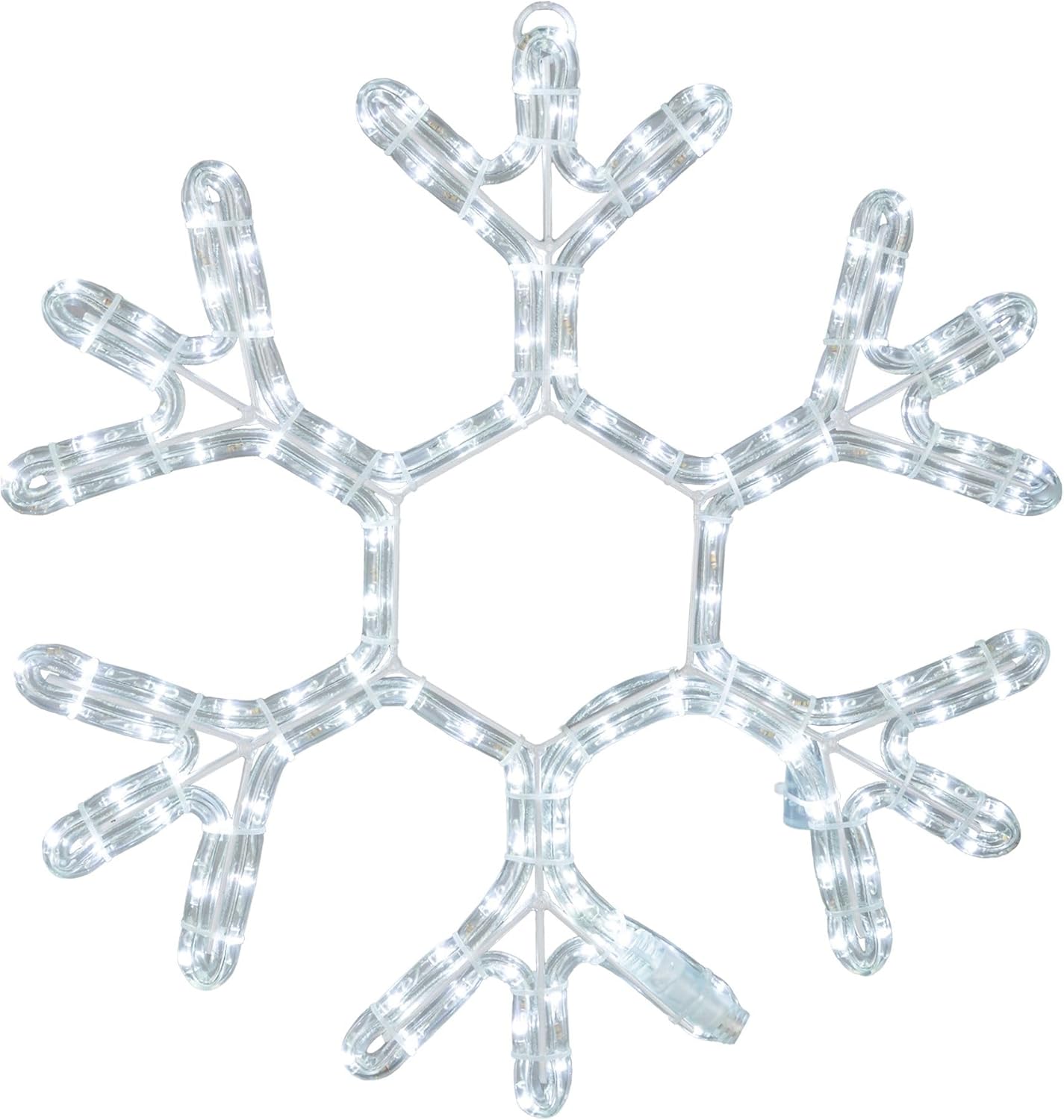 Creating eye-catching, professional-looking displays this holiday season will be easy using our stunning cool white & blue 30" Commercial Grade LED Snowflakes. Measuring 30" x 27", this customer-favorite LED snowflake is ideal for decorating any home or business structure. The highly durable LED rope light with lamps spaced every 1" is attached to a powder coated white frame that will not rust or fade. Save energy and create brilliant illuminations with these large snowflakes because they burn cool, use less energy, and shine much brighter than incandescent rope light snowflakes. Each 30" LED snowflake comes fully assembled ready to be installed using the provided hanging hook. 3 Season warranty. UL listed for indoor/outdoor use. Please call us if you have any questions about our LED snowflakes! 30" Deluxe 2 Color LED Snowflake Pure White & Blue LED Rope Light 3 Season Warranty 30" x 27" Includes 5' Power Cord & Hanging Ring Durable Frame won't Fade or Rust UV Protected Energy Efficient Fully Assembled For Indoor and Outdoor use