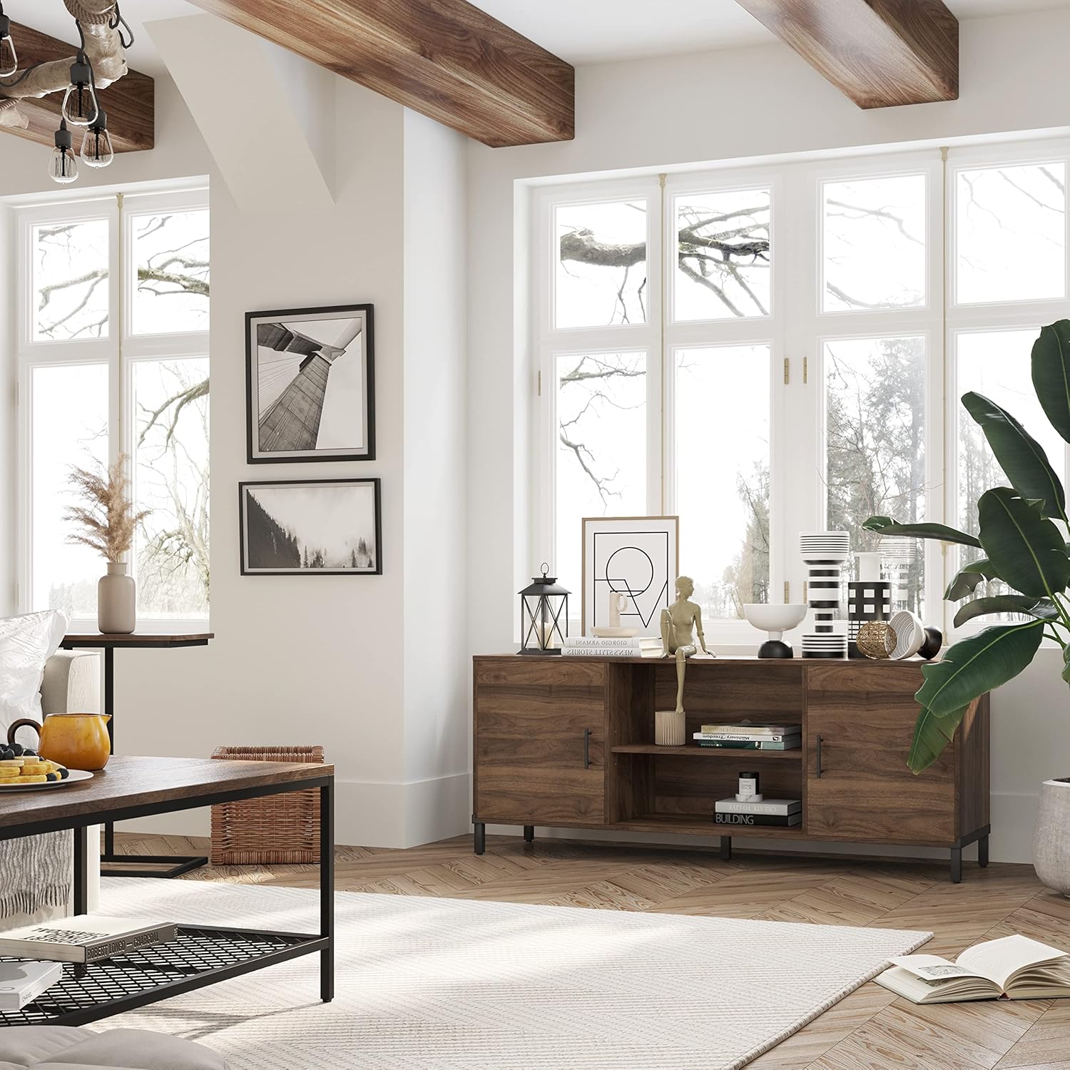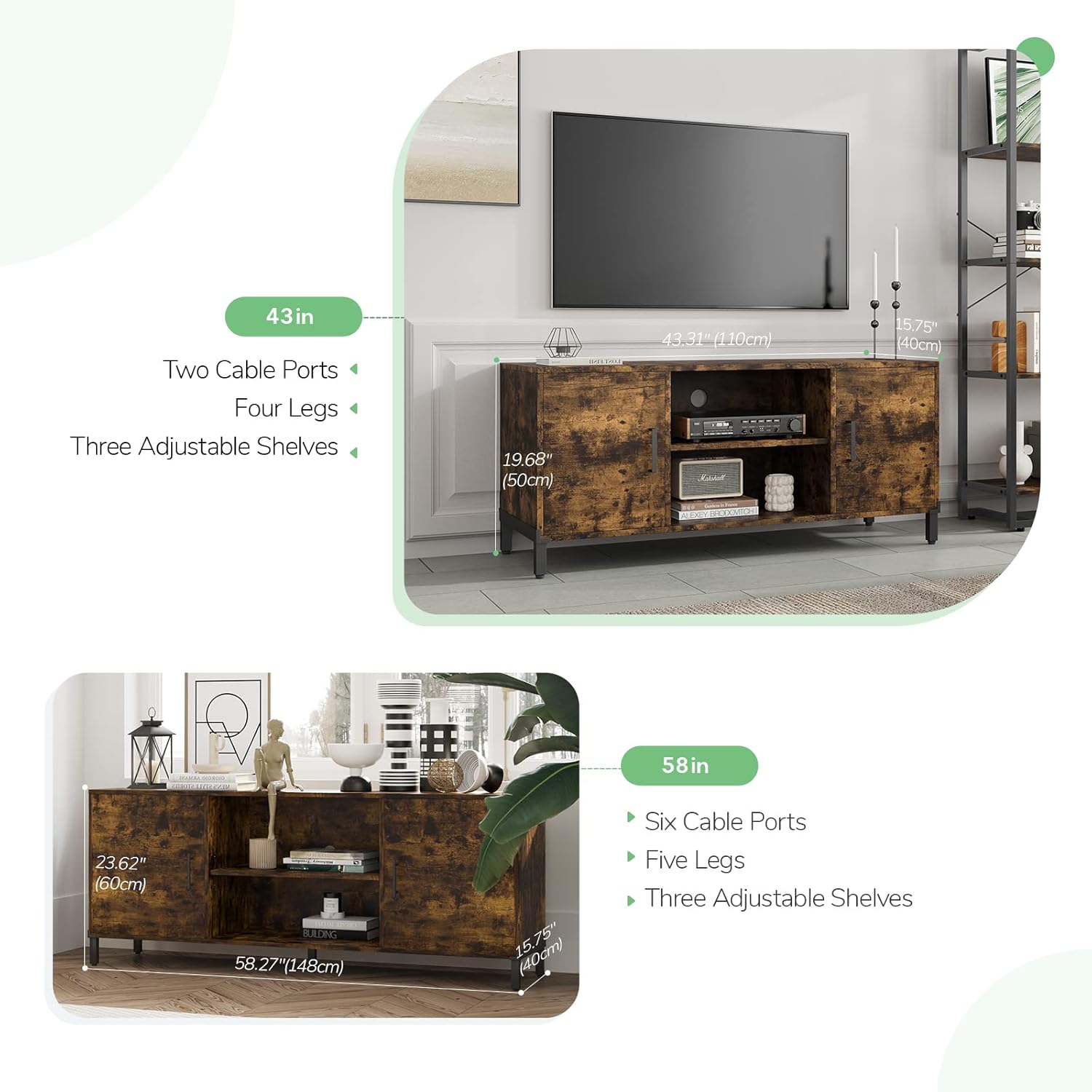 This TV & media furniture spruces up your sleek industrial-style living space with the aesthetic of minimalist. ●Dimensions:19.68” H × 15.75” W × 43.31” L ●Material: P2 grade 15 mm particle board, the main iron frame is black ●Load-bearing: The maximum load-bearing capacity of the desktop is 60 kg (132lbs) ●Storage: Two locker + Three adjustable shelves ●Foot pads: Four anti-scratch pads ●Port: Two cable ports