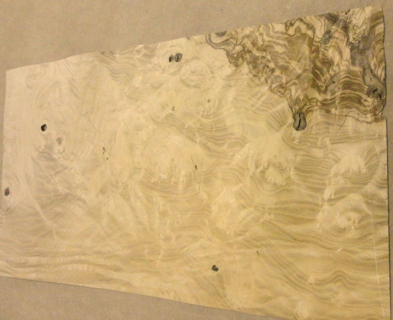 Olive Ash Burl wood veneer 7" x 12" raw with no backing 1/42" thickness. ONE piece as pictured. Burl wood veneer requires flattening prior to use. Last photos show our wood veneer softener (sold separately). Also note any holes or cracks that will need mended or filled. Ships flat in between thick cardboard. Other sizes and backed veneer are available. Trust the experience, knowledge, and reputation that has served the wood industry and novices since 1995. About pictures : Most pictures have been temporarily wet on the lower portion of the veneer to show what the grain may look like when finish is added. Color adjustments have been made to show the color as best as is possible. It is impossible to get photos exactly correct in color, but we have made an effort to do so. Backed products come with complete application instructions that are simple and clear. For raw veneer or un-backed products, we suggest using the Internet to see what advice is available as opinions vary on the best way to handle that product. Below is general information for most of our products. Make sure you check the listing to see which applies to the above product in particular. Thickness : (will not always be exactly correct, but relatively close) Paper-backed veneers = 1/40” Wood-backed veneers = 1/25” Raw plain veneer with no backing = 1/32”-1/42” How to cut : generally cut with a razor/box knife or similar tools and some type of straight edge is typically used. How to apply : Paper-backed and wood-backed veneers are generally applied with contact cement. Raw plain veneer is applied with white or yellow wood glue and must have pressure applied while drying. How to finish : most any conventional finishing products can be used with veneer that is applied correctly. Disclaimer: Sometimes veneers have minor splits or tears in them. These are usually taped or repaired in some manner and shouldn’t i
