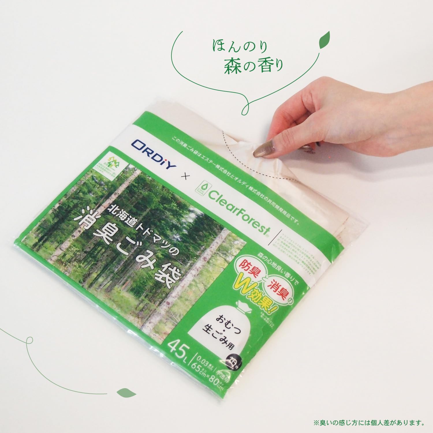 Deodorizing and deodorizing with a pleasant scent of forests. Plastic bag that traps the decay smell of food waste and other items. Can be used to replace diapers or for garbage Made with resin that is kneaded with coniferous powder, which is an unused resource that has been thinned for the healthy growth of the rice pine forest.