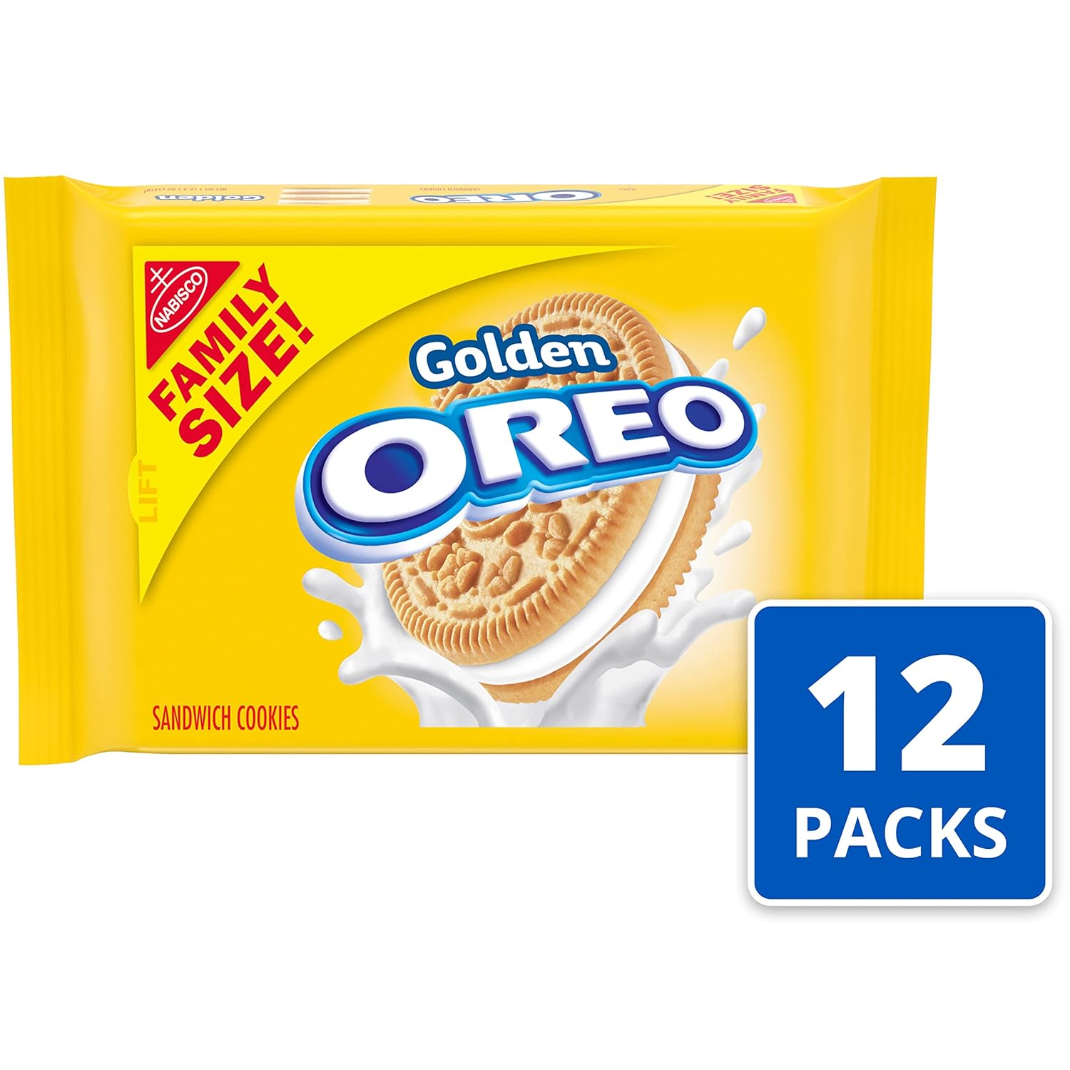 OREO Golden Sandwich Cookies have been America's favorite cookie for over 100 years. These vanilla sandwich cookies are filled with classic OREO creme filling, making these OREO cookies supremely delicious and dunkable. Golden OREO sandwich cookies are great for sharing with friends and family, enjoying with a cold glass of milk or serving at your next party. This snack food is also perfect for packing as lunchbox snacks at school or at work. The resealable packages with easy-pull tab keep vanilla cookies fresh and makes these vanilla cookies perfect for snacking, sharing or traveling. With 12 family size packs of OREO Golden Sandwich Cookies, you'll be ready for any snacking occasion.