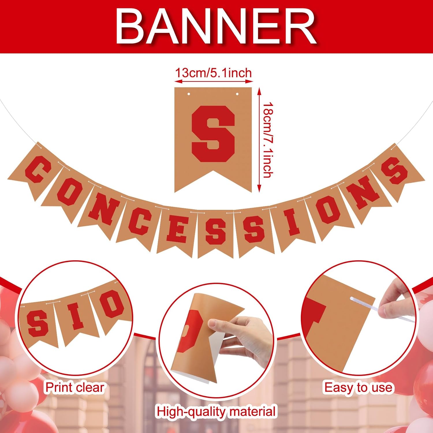 Features: Quick Setup for Busy Events: This concession stand decor kit assembles in minutes, allowing you to focus on serving guests during event hours. The pre-punched banners and elastic leg sleeves enable rapid decoration changes between different activities or shifts, nice for high-traffic environments. Multi-Use Decor Solution: Beyond carnival themes, this versatile kit adapts to various celebrations throughout the year. The classic red and white color scheme works equally well for holiday events, summer festivals, and community fundraisers, providing a year-round decorative option. Specifications: Material: spandex, paper Color: multicolor Size: 6ft tablecloth Package includes: 1 x Tablecloth 1 x Concessions banner Notes: Manual measurement, please allow slight errors on size. The color may exist a slight difference due to different screen displays. Please keep our product away from minors to avoid winding