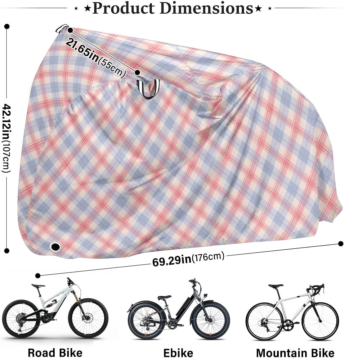 Outdoor Bike Cover Dimensions: 69 x 42 x 21.6 inches. Please note that this lid is for 1 and does not include two bicycles. Please measure the size before placing an order.Bike Cover Outdoor Material: Umbrella waterproof fabric. This fabric has strong tear resistance, can effectively protects your bike from the sun, dust, and water, and safeguard your .Product Features: Covers for Bike provides all-weather protection for your against rain, snow, leaves, bird droppings, wind, dust, scratches, etc., and offers UV protection up to 50+. Keep your as good as new for a long time.Safety & Anti-theft: Lock holes are reserved at the front wheel position and lock buckles at the rear wheel position to prevent wind dissipation, making it convenient to use and achieving an anti-theft effect. Bike Covers Outdoor is convenient to use and can be easily folded into a portable size. When not in use, it can be put into a storage bag.Outdoor Accessories: This Covers for Bike provides a protective guarantee for your beloved car and is an essential accessory for outdoor camping.
