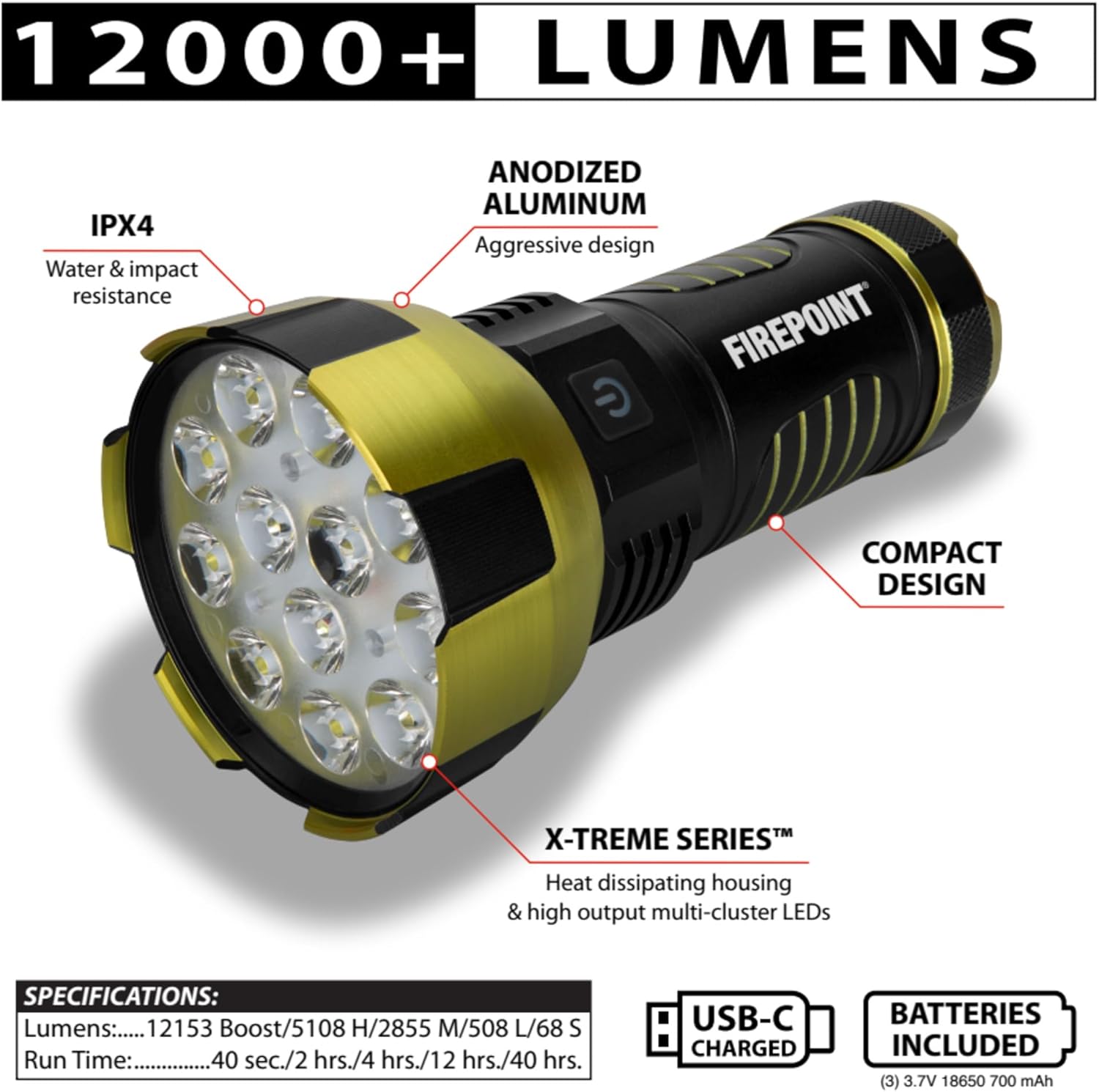 Bathe your workspace in a flood of bright LED light with this Performance Tool W2633 Firepoint Max 12,000 Lumen Rechargeable LED Flashlight. It features an anodized aluminum housing that is compact enough to fit in the palm of your hand and is designed to withstand tough conditions. The multi-cluster LEDs can provide a huge flood of light or an intense spot beam, and in Boost mode this light can blast over 12,000 lumens for up to 40 seconds. This light is both water- and impact-resistant and has a safety power switch that prevents accidental operation. Includes a braided 8 in. (20 cm) USB-C power cable. This light measures 5.7 in. in total length and the LED panel is 2.8 in. in diameter. Never get caught in the dark again - this Firepoint Max flashlight is the tough, extremely bright lighting solution for any job.