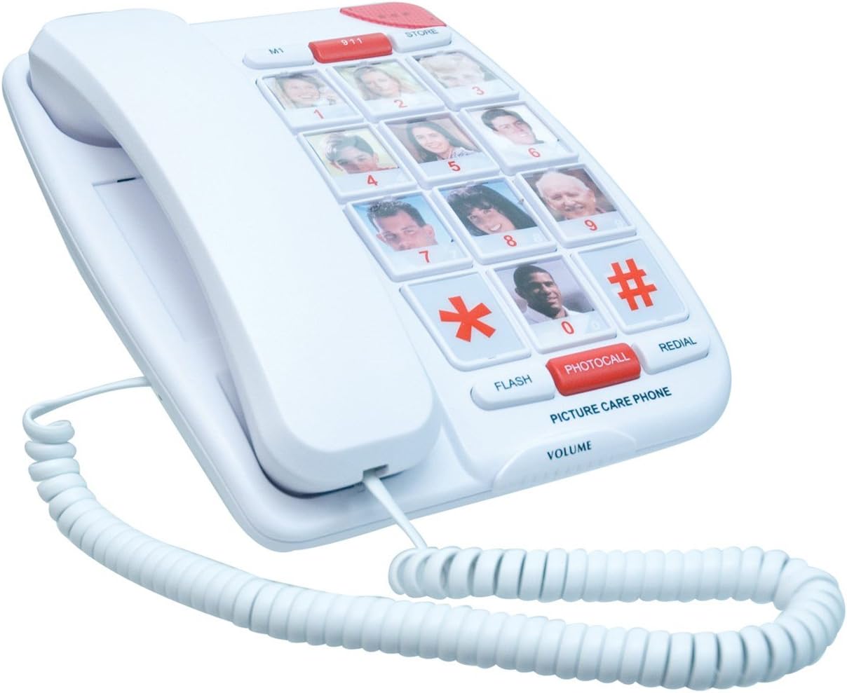 Put a photo of the 10 most frequently called people on the phone, program their numbers in, and next time you want to call them just push the photocall button and the picture. It's that easy to connect to those you love. At the flip of a switch you may also choose to have 10 one-touch keys for picture dialing ONLY. (This feature is great for those who aren't able to dial out telephone numbers.) Plus, all memory/speed dials are backed up for life even if the unit is unplugged from the line (no AC power or batteries needed). In addition this phone has a 911 button, last number redial, ringer off/low/hi and a flash button for call waiting. Please note that call waiting is a service provided by your local telephone company and you should call them for details. Pictures should be approximately 1" x 1-1/4" size. 90- day manufacturer warranty. Overall measurements: 7.5" x 9". Handset measures approx. 8" x 2" Shipping weight 1 lb, 12.1 oz. Product dimensions (imperial): 9 inch H x 7.5 inch L Product dimensions (metric): 228.60 mm H x 190.50 mm L