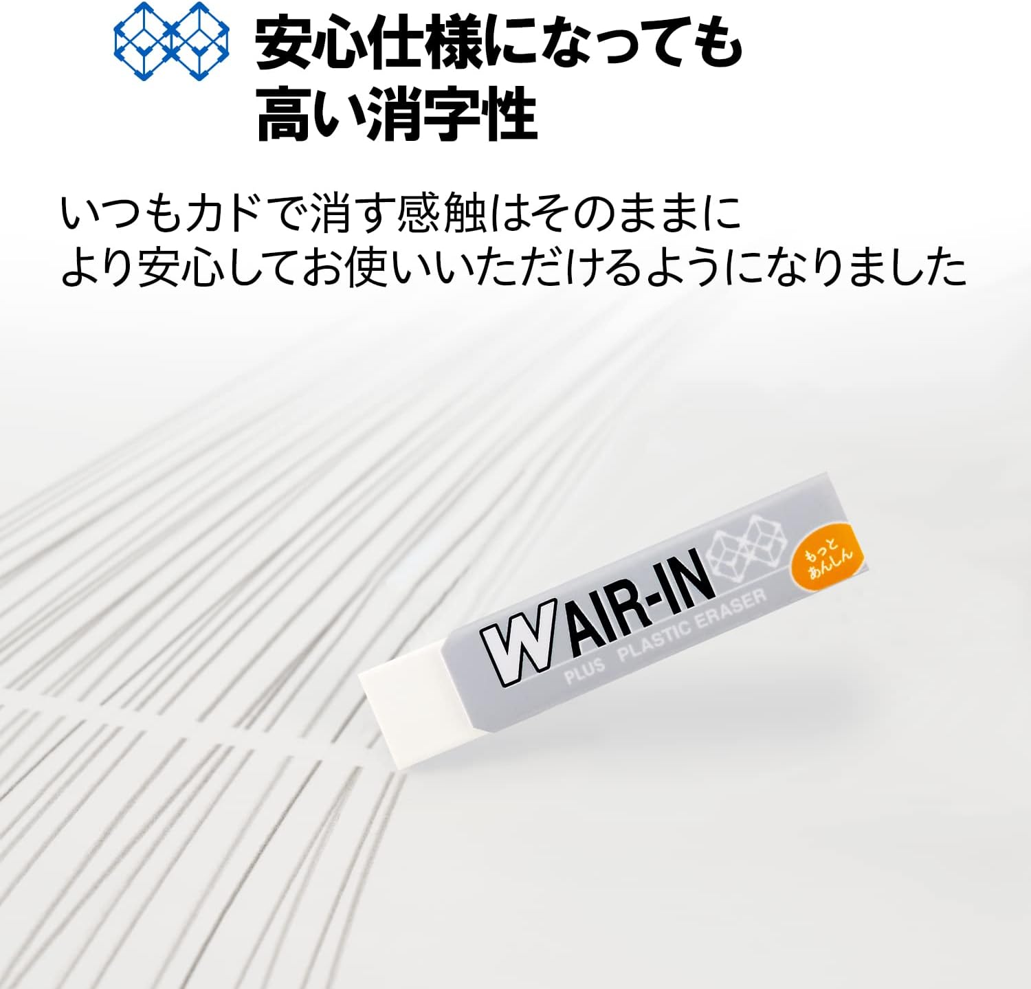 Plastic Eraser, Airin (AIR-IN) More Anshin Series "W Airin" Safe specifications using non-phthalate plasticizers. Uses non-phthalate plasticizers that conform to the safety standards of toys for children. The Airin Series is phthalate-free, so you can use it safely. Formulated with 2 types of air capsules. The combination of porous ceramic powder and airborne capsule powders can be erased with lighter force. Eraser particles wrap graphite particles to clean up brush marks The case is made of a new shape that is hard to break. By curving the top of the case, the eraser body is hard to break. Compact and slim shape. The slim stick type makes it easy to hold and it fits neatly into a pen case, making it convenient to carry around. EN 71-3,5,9