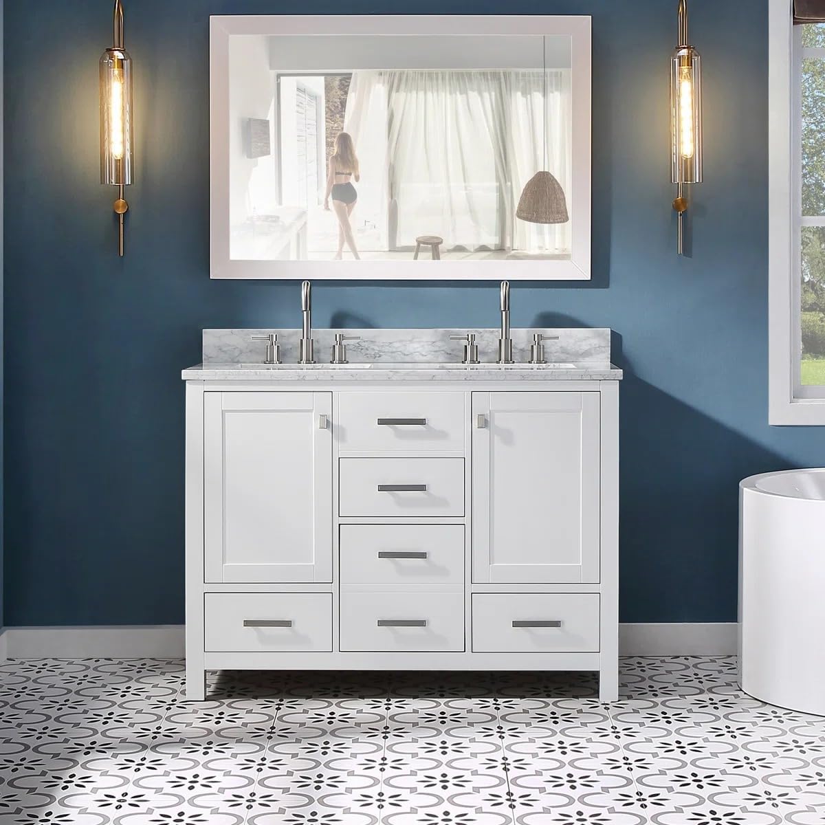A perfect blend of value and modern design, this elegant white vanity maximizes your bathroom space. Crafted from solid oak and durable plywood, it showcases premium quality with uniquely styled handles, soft-close glides, and hinges. The genuine Italian Carrara white marble top with an under-mount sink highlights superior construction and meticulous attention to detail.