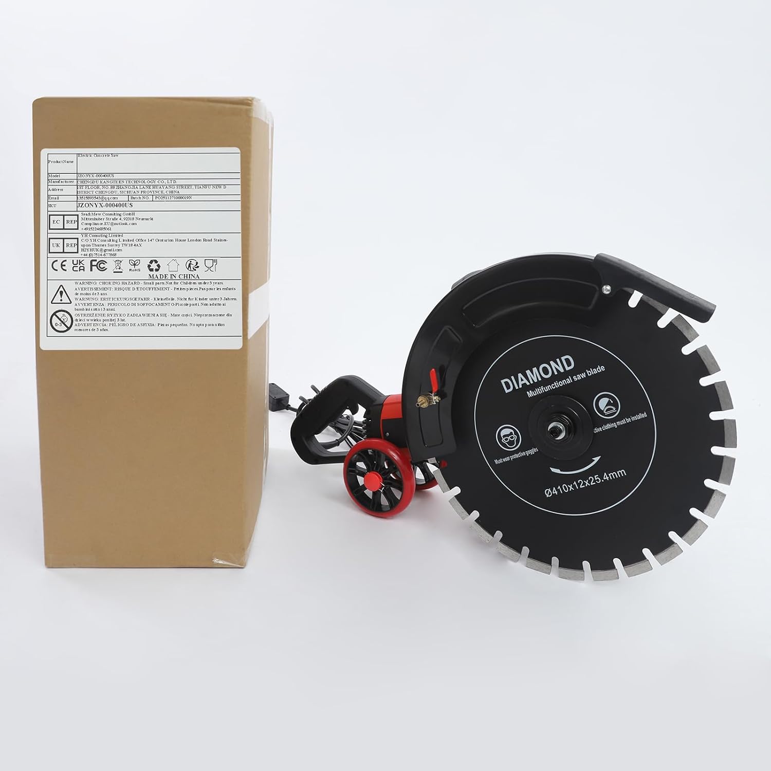 Upgrade your concrete cutting toolkit! Beyond 4000W power & dust-free wet cutting, this saw boasts a lightweight aluminum gearbox for smooth power transfer, side auxiliary pulleys for effortless wall/flat surface cuts, and external carbon brushes for easy maintenance. Adjust the protective shield angle to block splatters, swap blades to cut wood/metal, and enjoy quick assembly with our English manual. Ideal for DIYers and pros! SpecificationMaterial: Carbon Steel, Diamond, Nylon, Aluminum, CopperColor: Black, RedAssembly Required: YesPower Source: Corded ElectricPlug Type: US StandardMotor Type: Pure Copper MotorNumber of Saw Blades: 1Water Pump Model: GAIS-1201500Water Pump Input: AC100-240V 50/60HzWater Pump Output: DC12V 1.5AVoltage: 110VPower: 4000WSpeed: 3000RPMMaximum Load Power: 5800WMaximum Cutting Depth: 165mm/ 6.5inPower Cord Length: 3m/ 9.84ftWater Pipe Length: 5m/ 16.4ftWater Pipe Inner Diameter: 6mm/ 0.24inApplicable Pipe: 6mm/ 0.24inSaw Blade (D*T): 410*3mm/ 16.14*0.12inSaw Blade Hole Diameter: 25.4mm/ 1inGross Weight: 14kg/ 30.86 lbs Package Size: 62*24*42 cm/ 24.41*9.45*16.54inProduct Size: 60*21*42 cm/ 23.62*8.27*16.54 inPackage Included1* Electric Concrete Saw1* Protective Cover1* Water Pipe 1* Water Pump 1* Blade2* Rolling Pulleys1*English Manual All Accessories for InstallationNotes1.Please beware of potential safety hazards in electricity use. Please use this product according to the English manual, take necessary personal protective measures, and keep them out of reach of children.2.Please note that you will need to prepare a bucket when using the pump.3.When cutting walls vertically, please make sure the head is facing down so that water does not enter the motor and burn it. Please operate the machine from up to down when grooving, it will be easier to save energy while protecting the motor.4.Please regularly check whether the carbon brushes are wear and tear, and replace the carbon brushes in time when the sparks are large.5.When cleaning the head, please avoid water entering the body through the vent.6.Please note that the pump should not be pumped empty for a long period to avoid damaging the pump core.