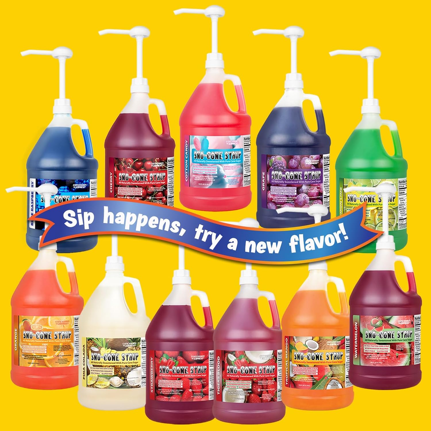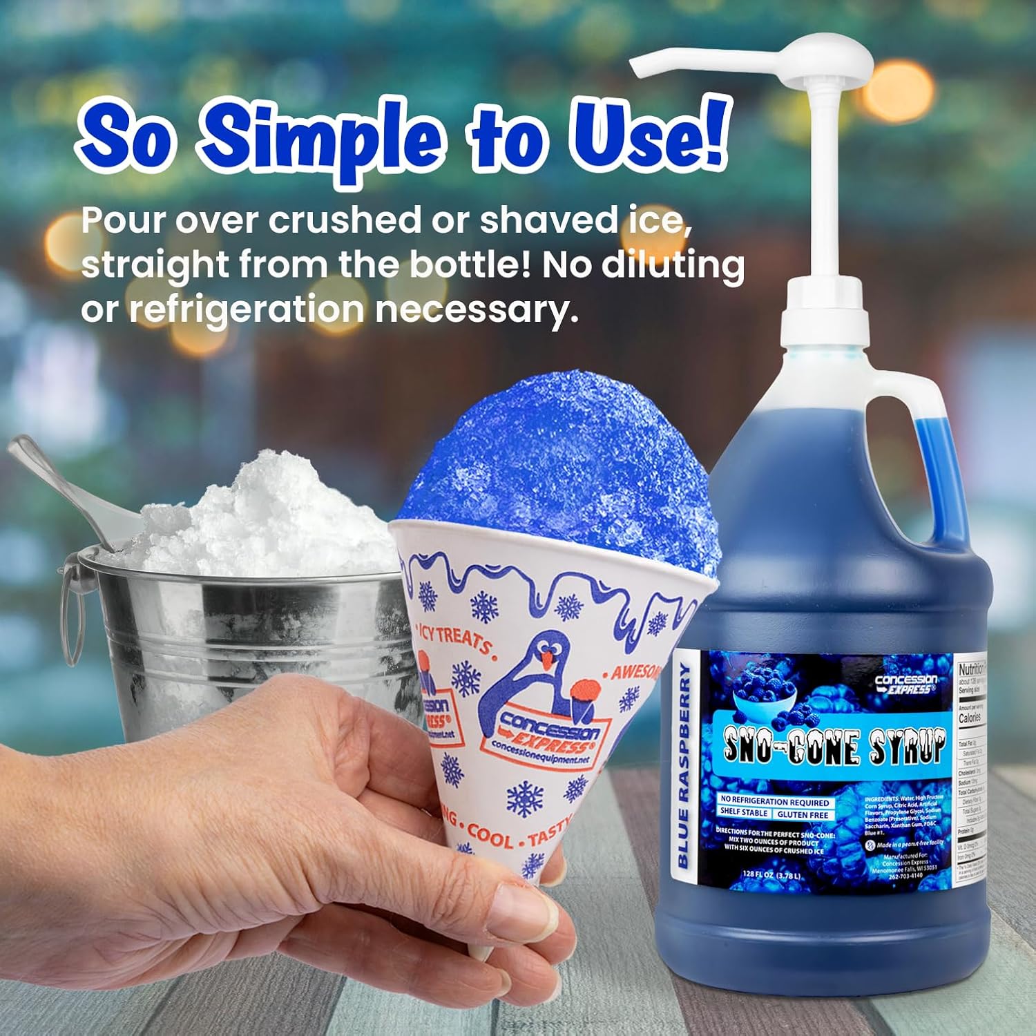 Create delicious sno-cones and shaved ice with our premium Blue Raspberry Sno-Cone Syrup, made with pure cane sugar and irresistible flavor for a bright, refreshing taste everyone loves. This classic Blue Raspberry Syrup delivers the perfect balance of sweetness and blueberries, bringing carnival-quality frozen treats right to your home, party, or concession stand. Crafted for smooth pouring and excellent flavor absorption, this syrup evenly coats ice for vibrant color and long-lasting taste in every bite. Whether you’re hosting backyard gatherings, birthday parties, school events, or running a business, this syrup provides consistent, professional-quality results every time. Each bottle includes a convenient 1-ounce displacement pump, allowing for quick, mess-free, and portion-controlled dispensing. There's no guessing, no spills. Just pump, pour, and enjoy. Pair it with other flavors to create custom blends or serve it solo for a bold Blue Raspberry experience.