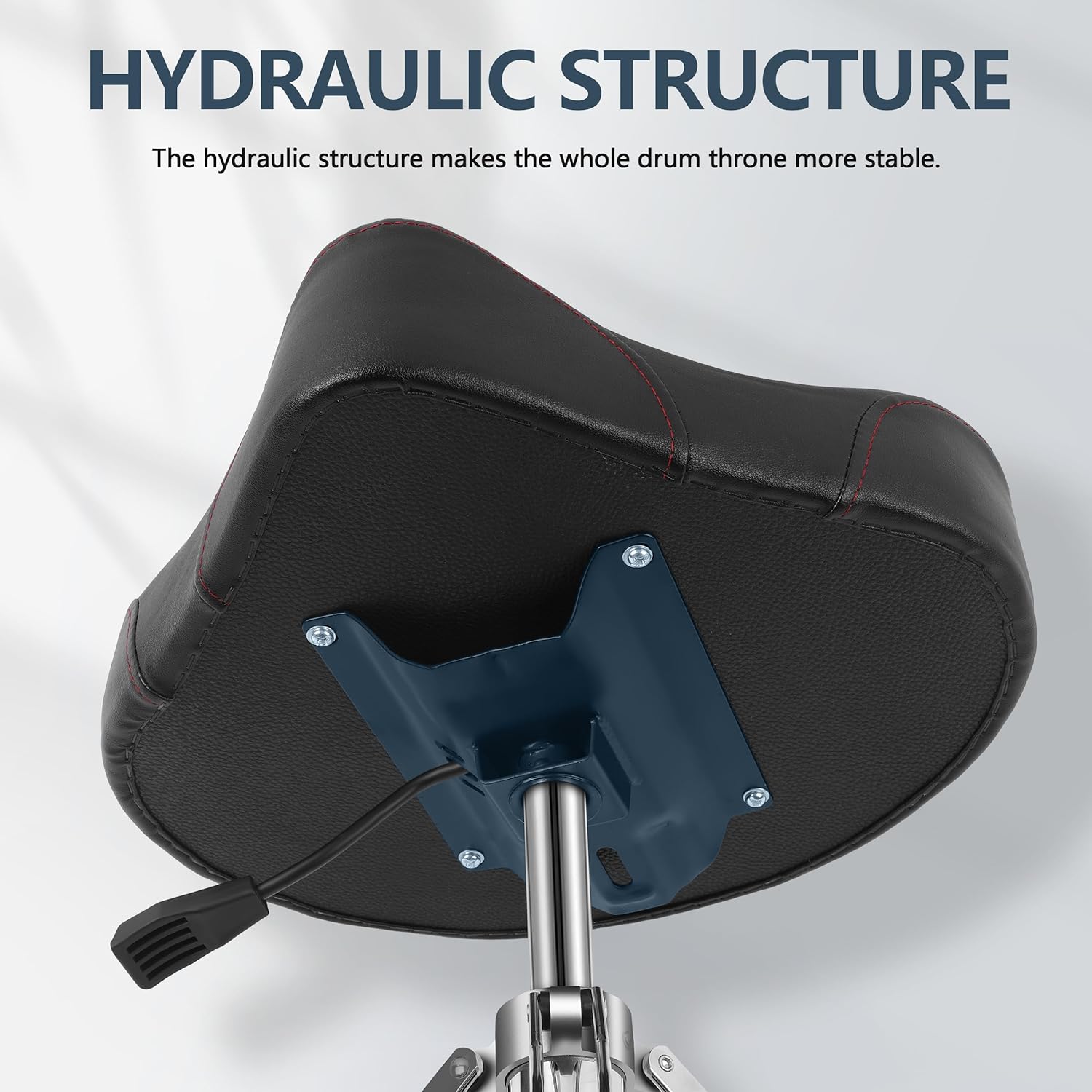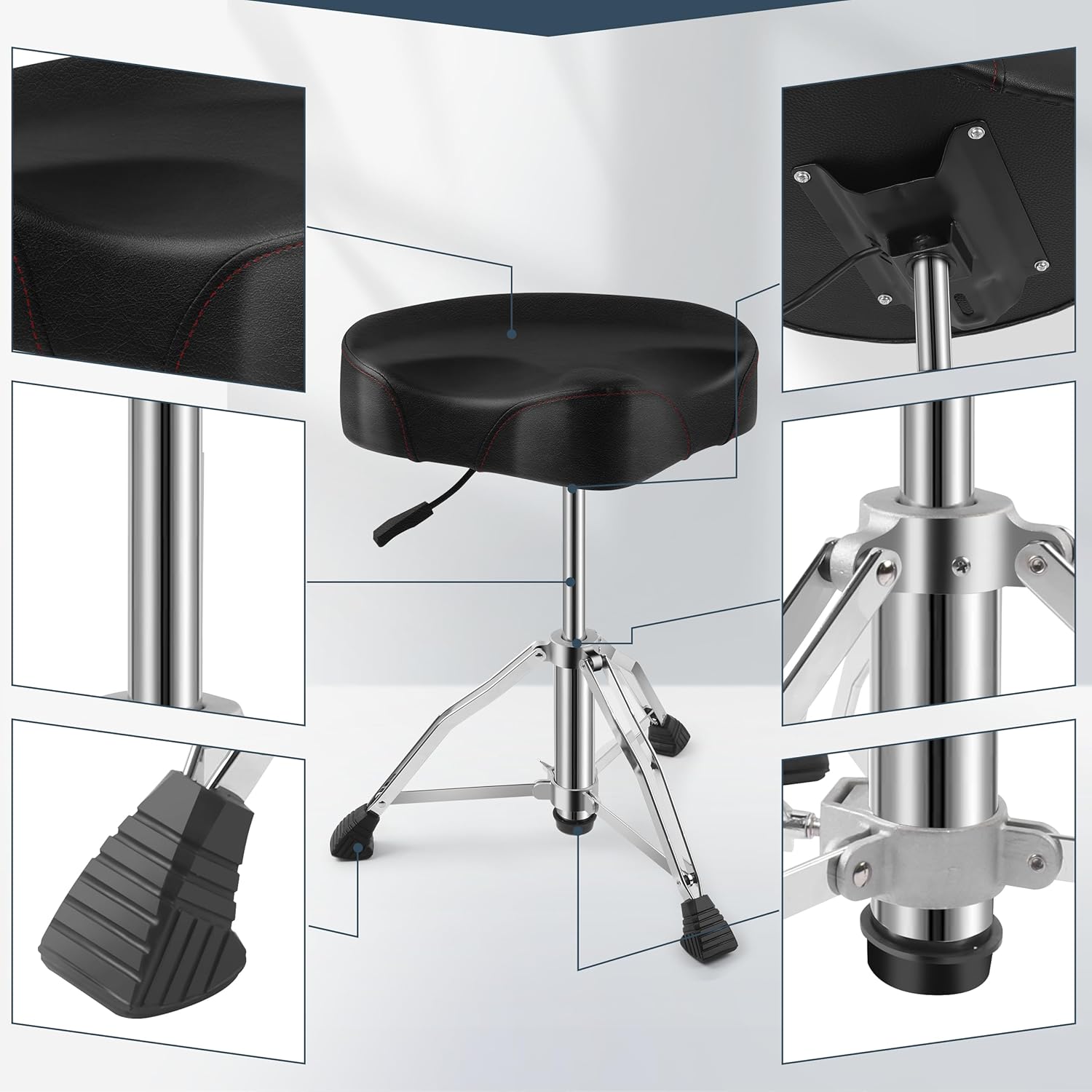 Drum Throne: The drum seat base is hydraulically height-adjustable for safety, reliability and quick adjustment. The adjustable height is 17.3 inches - 24.6 inches. The drum seat is also shock absorbing, perfect for drummers. Drum Stool:Design wider motorcycle seat, perfect for different weight. Maximum weight capacity: 450 lbs. High-grade leather wrapped in soft memory foam, enlarged stool surface (17.3 inches * 14.9 inches * 3.9 inches) is more supportive and comfortable than regular drum throne seats. Drum Throne Seat: High-quality metal material, sturdy base, dual support legs, and rounded support design provide unparalleled stability. Feel free to use this drum chair as it can easily support up to 450 pounds. Drum Seat:STURDY SUPPORT LEGS: Each leg of the drum seat utilizes two-piece, thickened metal support rods. High-quality connectors make the stand more stable and durable. The drum stool's enlarged non-slip rubber pads provide excellent stability and protect your floor. Drum Stool Adjustable Height:The adult drum stand is ergonomically designed to provide optimal comfort and support during playing!