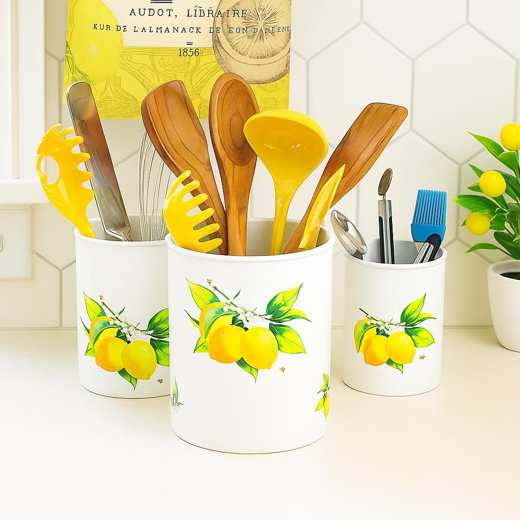 Reston Lloyd has been in business for over 50 years and we are proud to continue our tradition of producing high quality kitchenware products. This set of utensil holders is great because you can put the right utensils in convenient places within your kitchen. It is very helpful to have your spatulas near your stove but you might also like to keep your whisks near your mixer. And let us not forget about the all the mini tools which are over looked like, vegetable peelers, ice cream scoops and pizza cutters. For these reasons we created this 3pc set of holder that all match and are sure to brighten and organize your kitchen. Each plastic utensil holder is able to hold a good amount of utensils and tools while being rust free. Also don't worry if the holder is knocked to the floor or you dropped your heavy metal ladle in the holder too hard, our durable plastic will be able to handle the everyday tug of war that can occur in your kitchen.