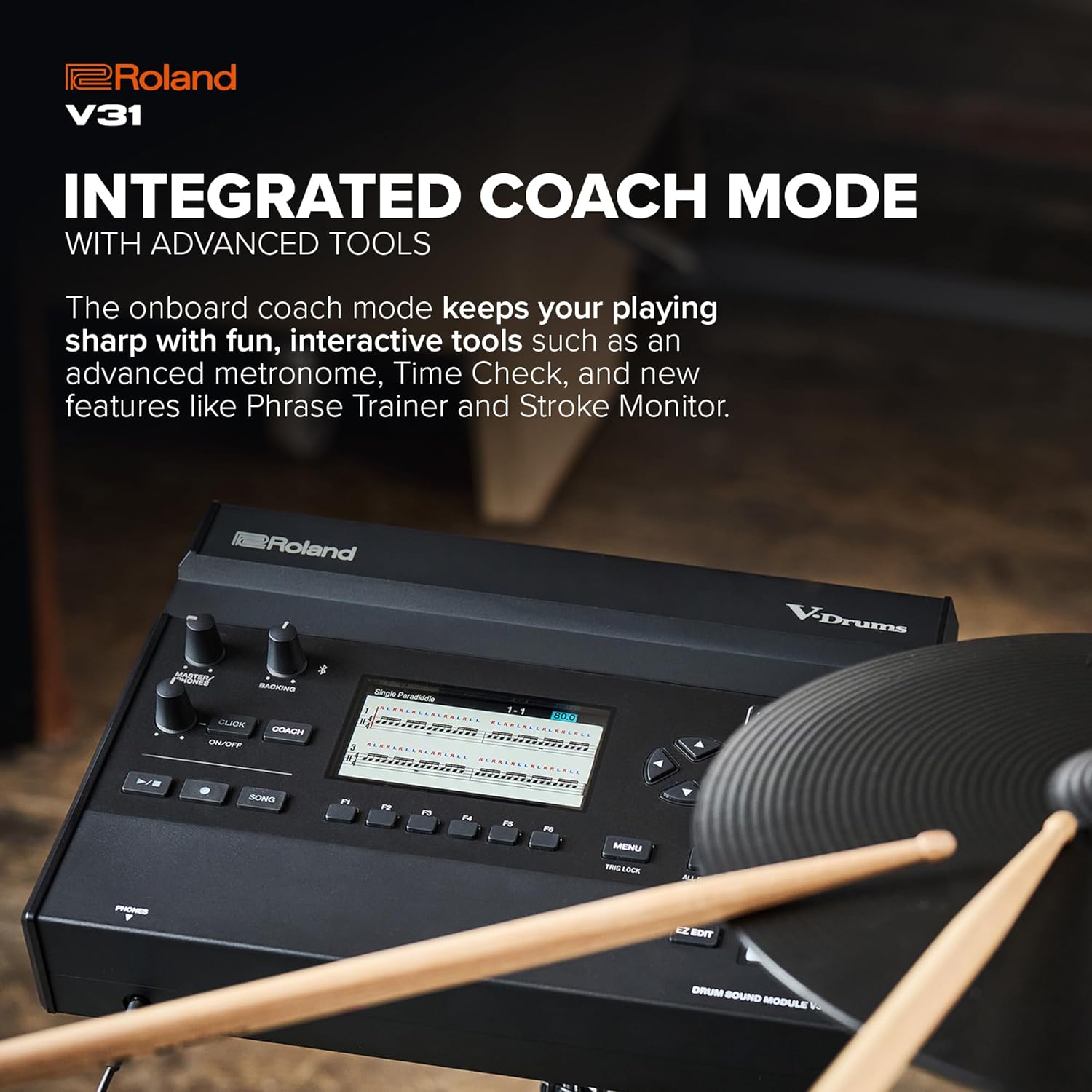 The V31 sound module is the core component of the V-Drums 3 Series, delivering the power and expression of Roland’s flagship V71 engine in a compact, accessible format. It combines next-generation response and multi-layered drum and cymbal instruments into a straightforward interface, giving drummers a premium sound experience without the bulk or complexity. And with onboard practice tools, wireless connectivity, and smartphone app integration, you can practice smarter, perform with confidence, and grow your sound options with an ever-expanding range of V-Drums expansion content on Roland Cloud.