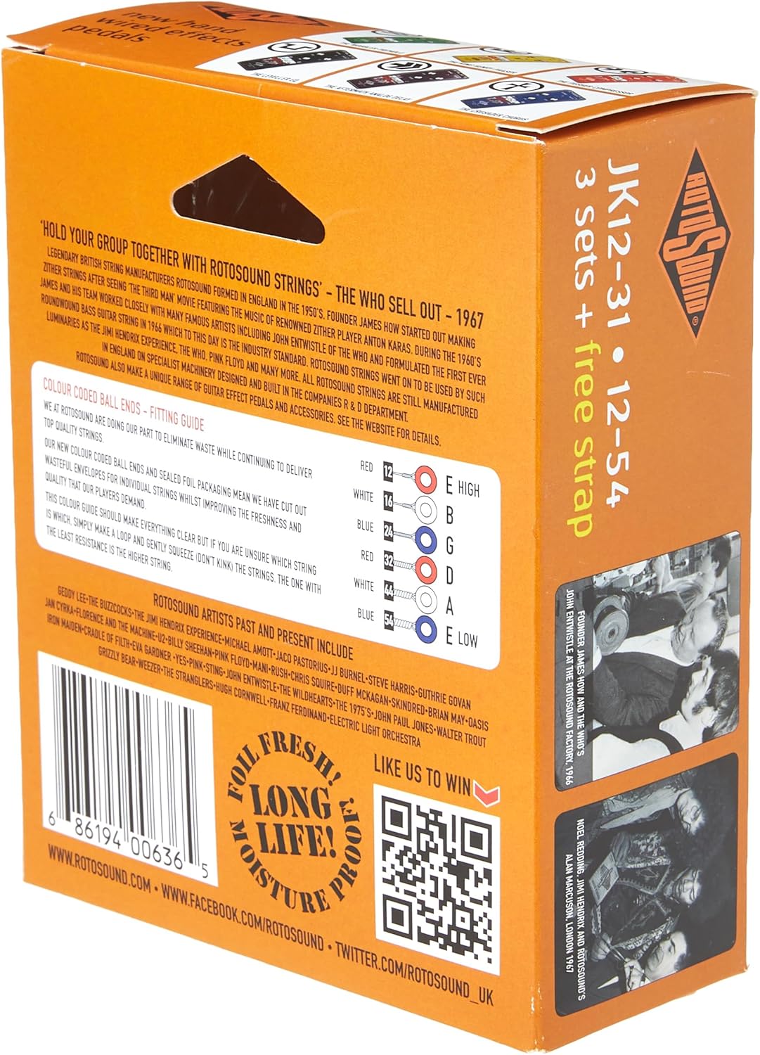 Product Description Our best selling acoustic guitar string known for their superb tone, clarity, and sustain. Wound with a 92/8 bronze alloy made especially for us to our exacting specifications in the UK. Loved for their balanced tone with a warm bass and clear top end, Jumbo King acoustic strings remain popular with guitarists the world over. Many famous players have chosen to string their acoustics with Jumbo Kings including Noel Gallagher, Bob Geldof, Jarvis Cocker, Jeff Lynne, Gordon Giltrap, and John Redbourne. Set Contains: 3 sets of JK12 acoustic guitar strings plus 1 webbing strap