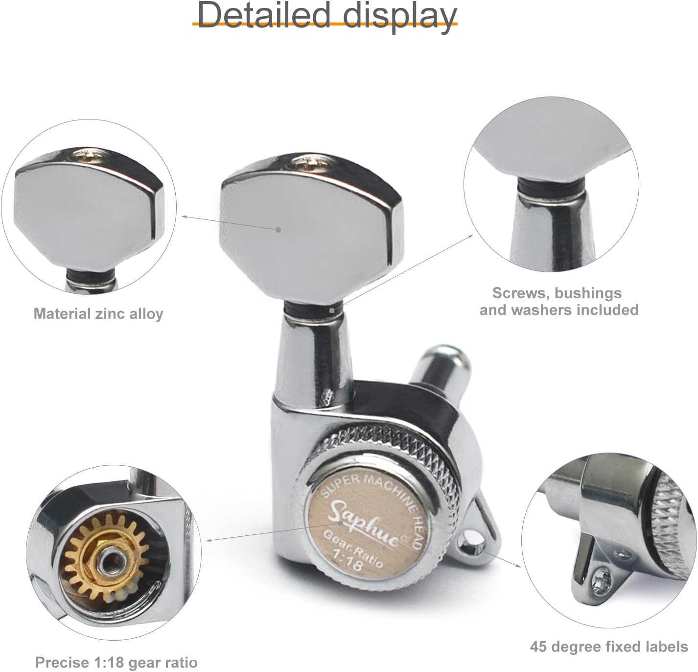 Features: 100% new and high qualit Guitar locking tuning machines with heavy duty internal gear, sturdy and convenient. Easy to install and easy to replace your old or dirty guitar tuning pegs. Precision 1:18 gear ratio with sealed lubrication, cast housings and metal knobs Hexagonal shaped button with sealed housing and 45 degree fixing tag Mounting hardware (screws, bushings and washers) included Specifications Material: Zinic Gear Ratio: 1:18 Position: 6R Colour: Black, Gold, Chrome Size: as the picture Package Included: 1 x Guitar Locking Tuners Note: Due to the difference between different monitors, the picture may not reflect the actual color of the item. Thank you!