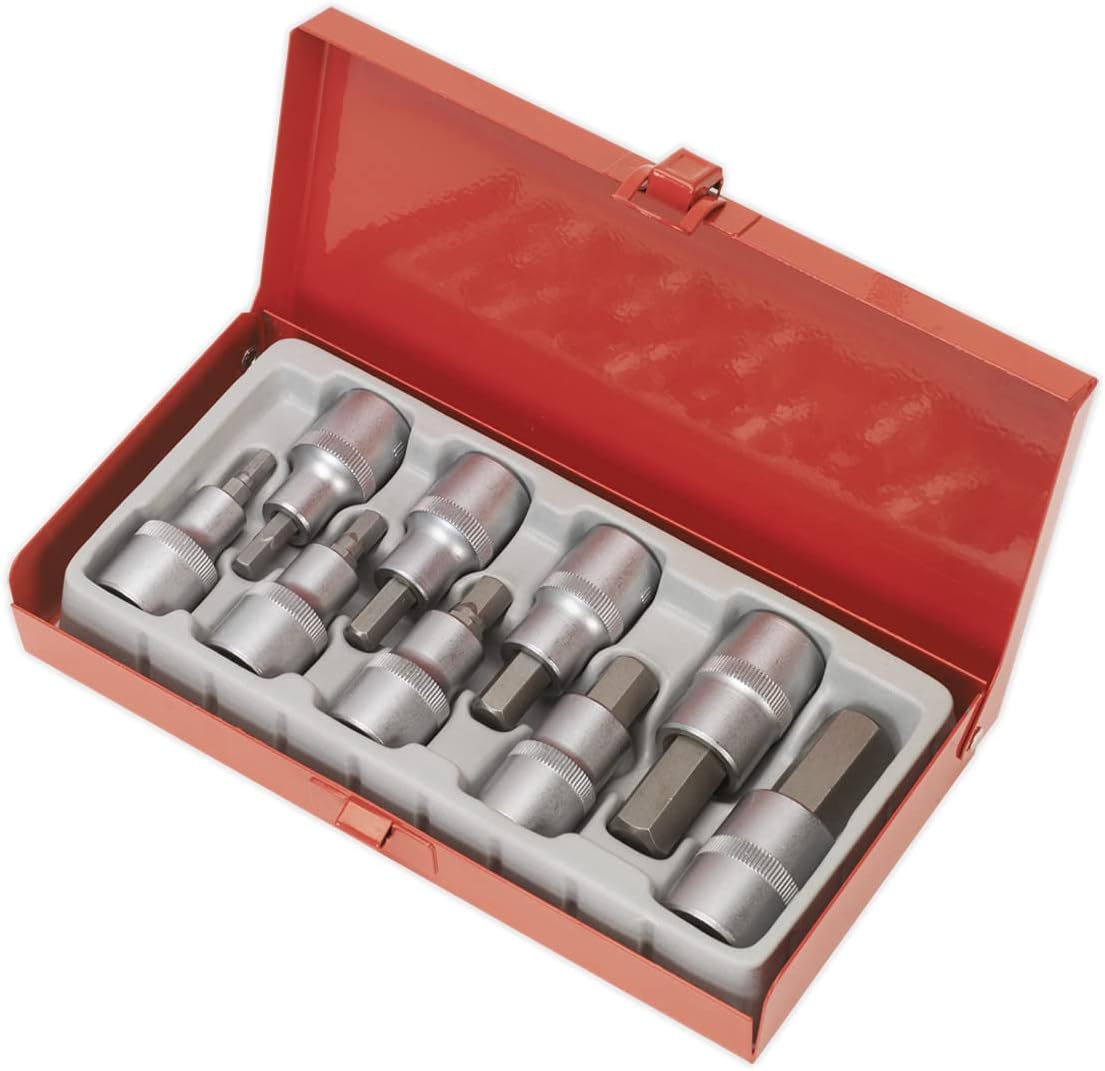 Product Description Forged Chrome Vanadium steel sockets with S2 steel hex bits. Sockets heat treated and chrome plated for resistance to corrosion. Satin finish with knurled ring to assist gripping socket with oily fingers. Supplied in steel storage case. Set Contains: Hex Socket Bit Set 9pc 1/2"Sq Drive