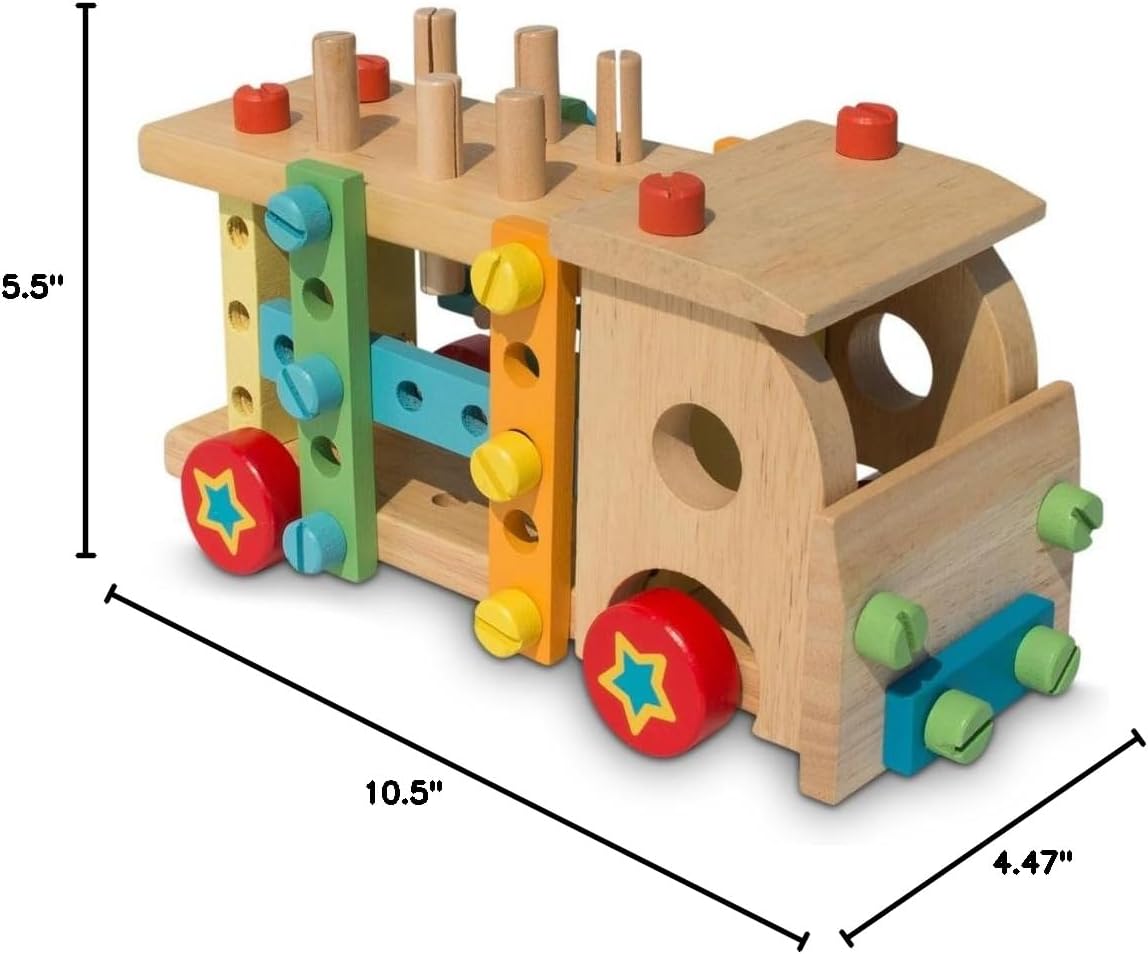 Wooden Truck with Building Tools Toy SetOur line of wooden toys allows children to use their hands and to improve motor skills and learn different objects! You kid will learn how to use the screwdriver and hammer to remove/ attach different parts and build the crane.All pieces made of solid wood.These well built wooden sets will last multiple childhoods and are certified safe and toxic free. -4.25 Inches x 5 Inches x 10 Inches - Assembled Truck Dimensions -Sturdy Wooden Construction -18 Wooden Screws -Wooden Screwdriver and Hammer -Spinning Wheels -Gift Boxed -CERTIFIED SAFE AND TOXIC FREE