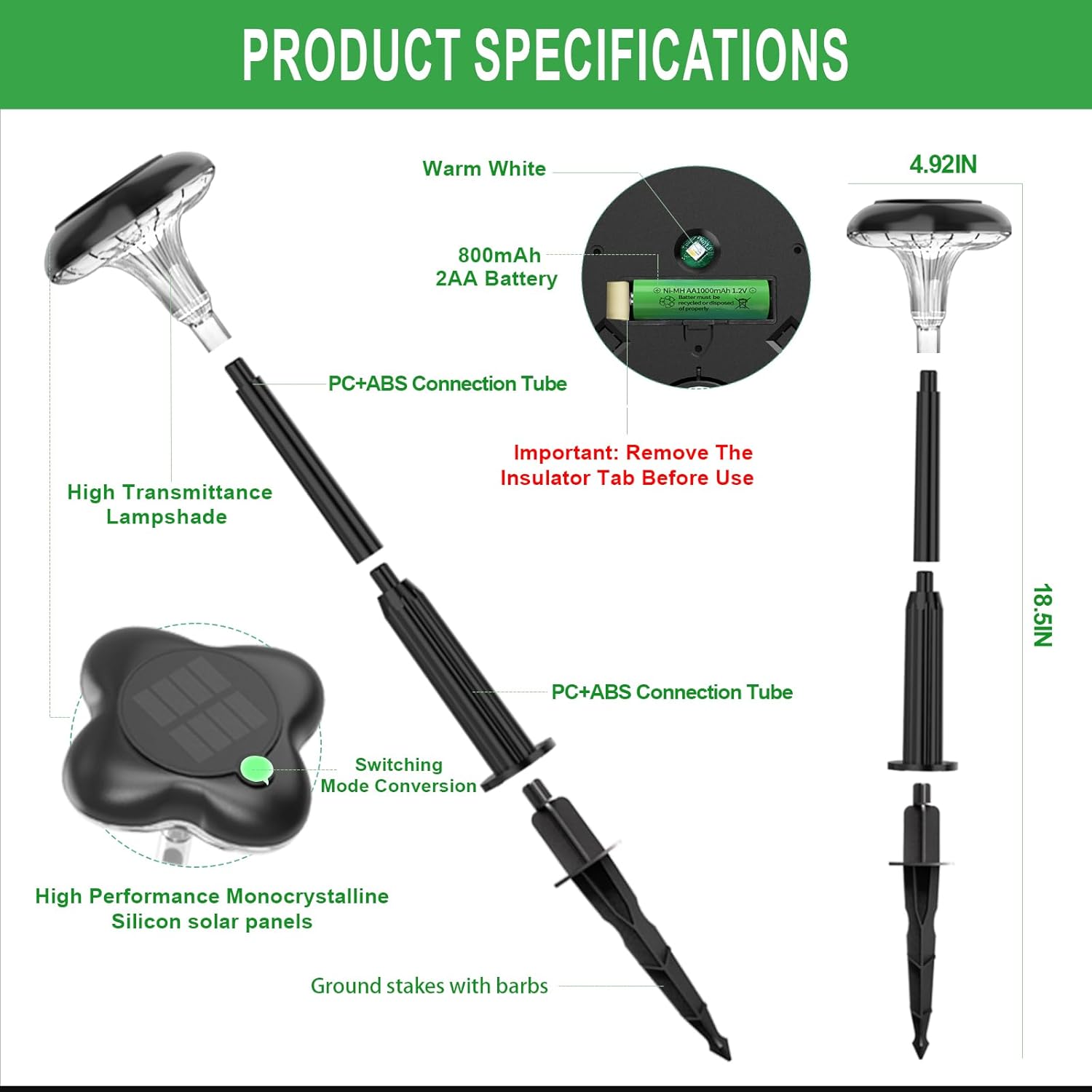 High Quality Solar Panel The solar lights for outdoor are equipped with high quality monocrystalline silicon solar panels with 35% photovoltaic conversion efficiency. The outdoor solar lights automatically absorb sunlight during the day and provide at least 8 hours of lighting at night. Solar powered, energy saving, environmentally friendly and pollution-free. Add a charming and eye-catching element to your outdoor lighting.