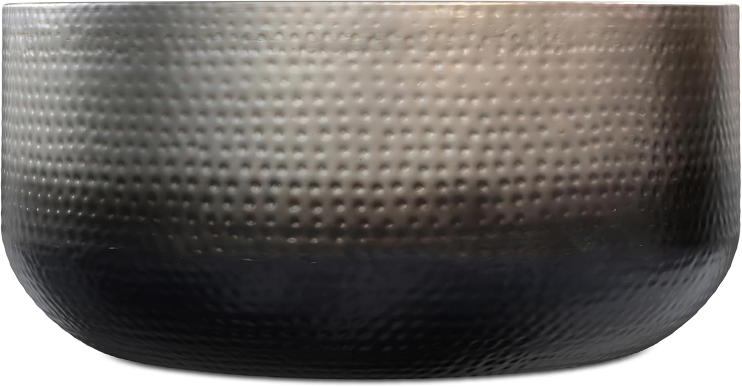 Bring sculptural dimension and artistic flair to your living room with the 36-inch Nova Metal Coffee Table in Silver Ombre. This bold centerpiece is hand-hammered from durable iron and finished in a gradient silver ombre that transitions from luminous to moody for an eye-catching, modern statement. Its generously sized round surface offers ample room for hosting drinks or displaying coffee table books. Finished with a protective powder coat to resist scratches and spills, this contemporary drum table arrives fully assembled and ready to make an impact from the moment you unbox it. Whether you’re styling a loft, open-plan condo, or cozy family space, the Nova Coffee Table pairs visual drama with practical durability, all wrapped in our signature craftsmanship.