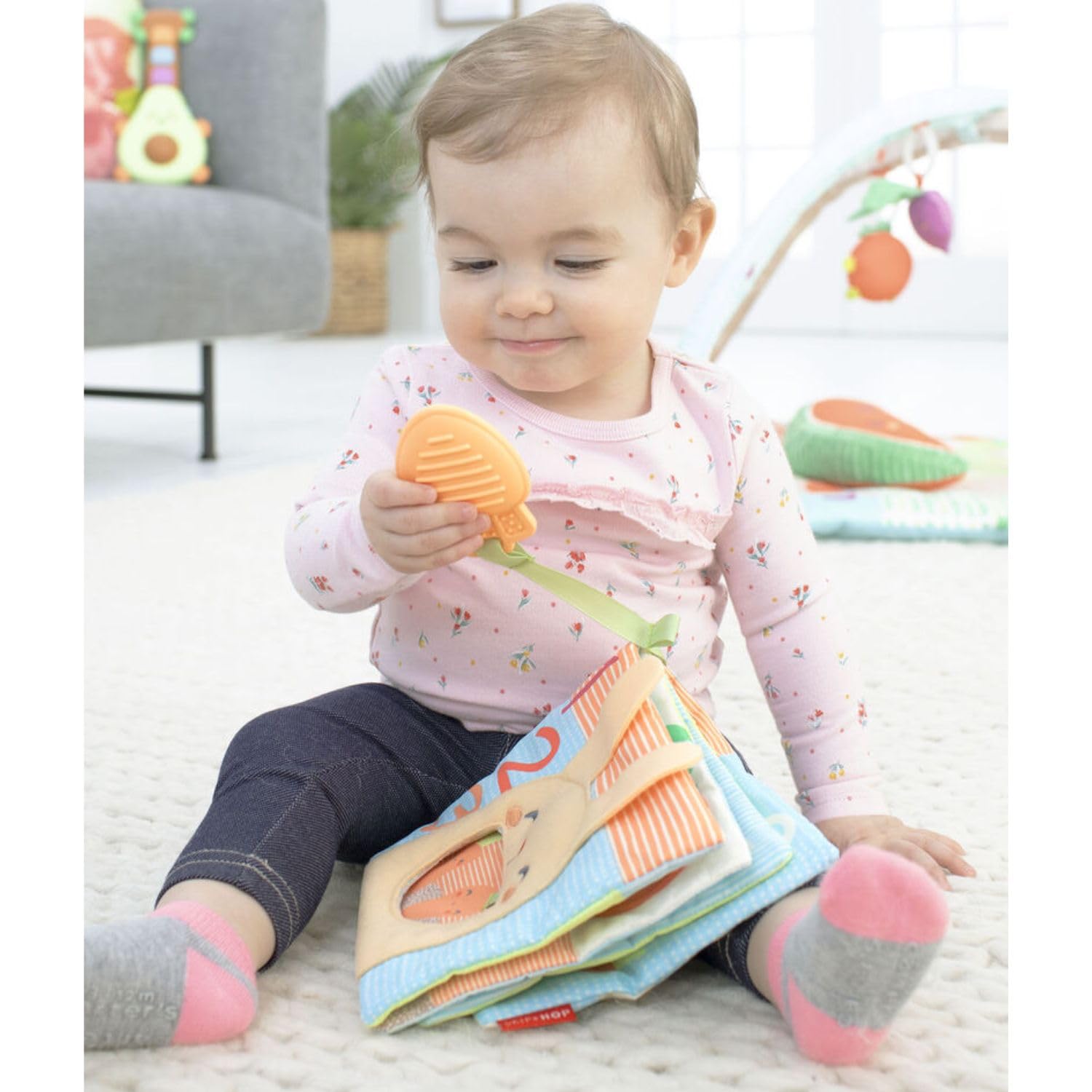 Filled with engaging activities for baby, this cute interactive book features soft pages with crinkle sounds, a baby mirror, colorful numbers, animals and garden artwork. Pop the carrot teether in and out of the hole for peek-a-boo play.