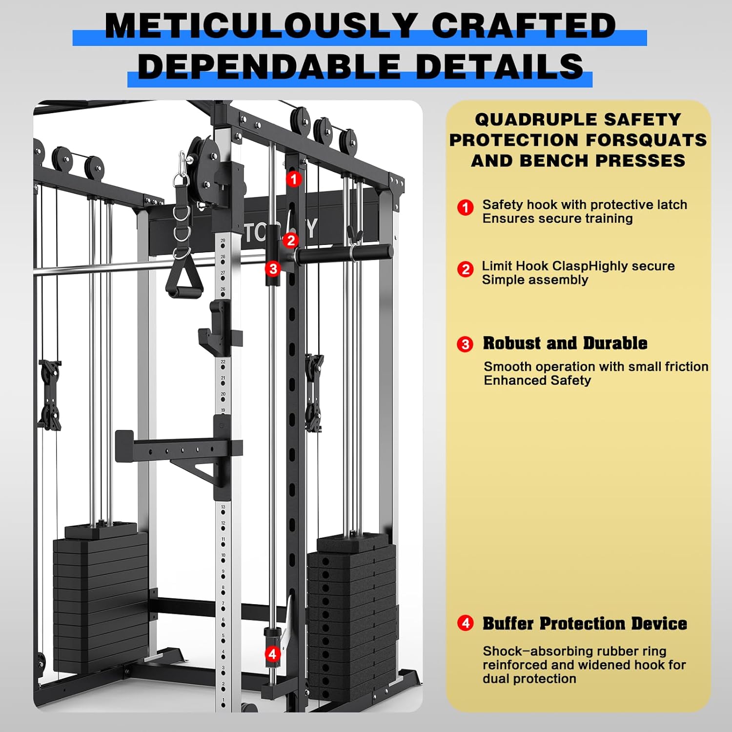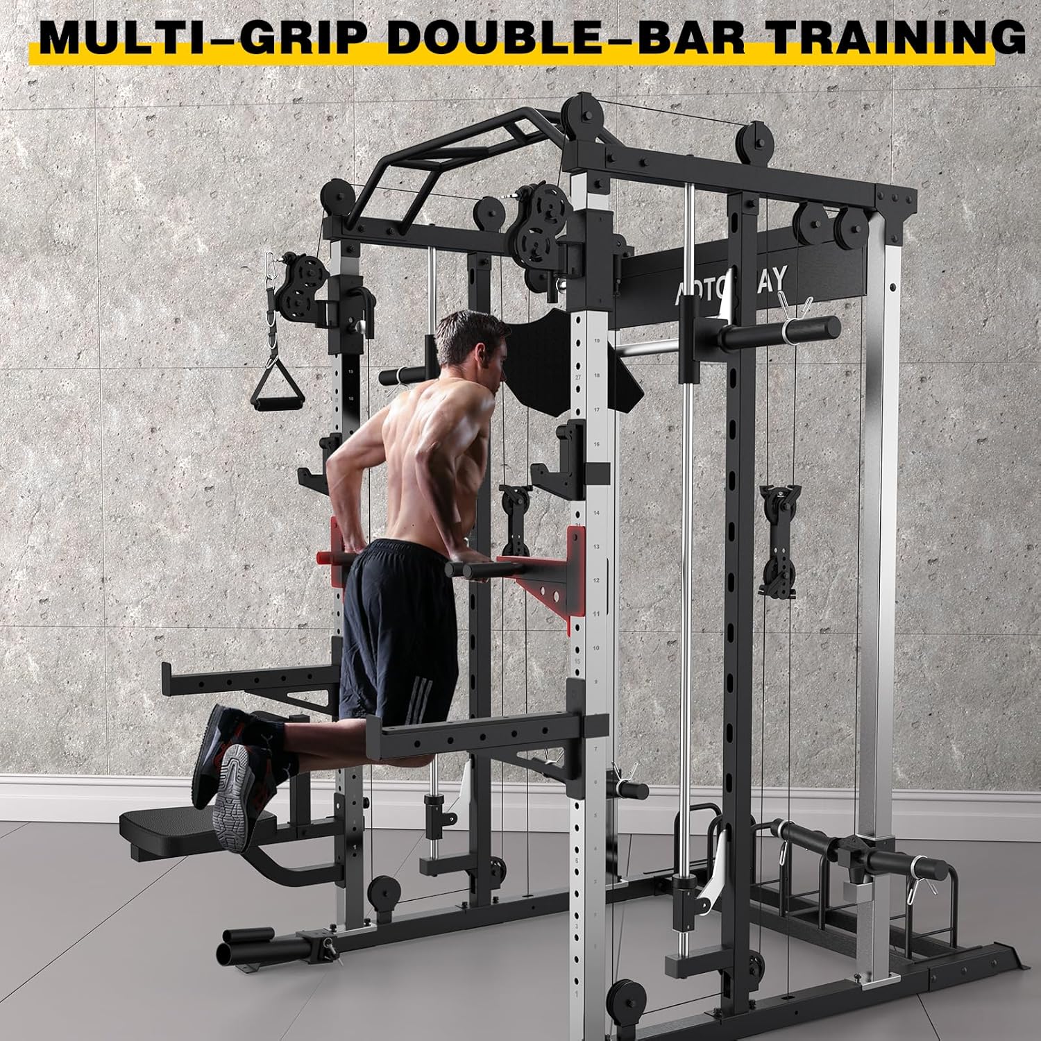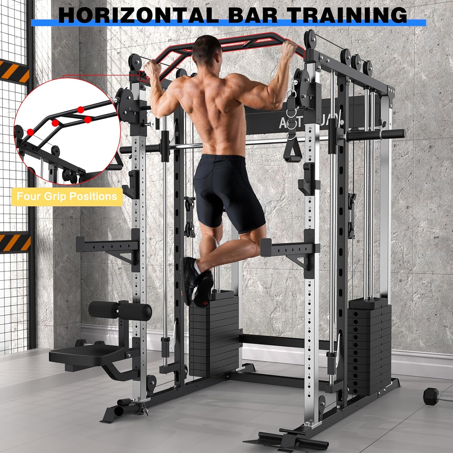AOTORJAY Smith Machine Strength Training Squat Rack with Smith Bar, Power Cage with LAT Pull-Down Systems, Cable Crossover Machine for Home Gym and More Training Attachment