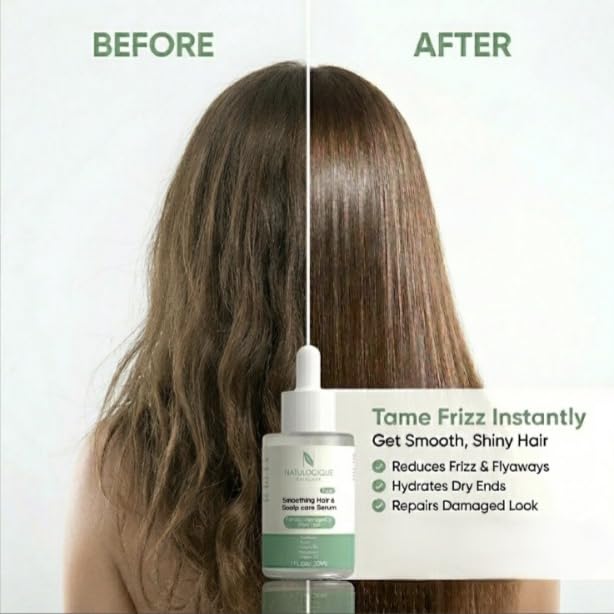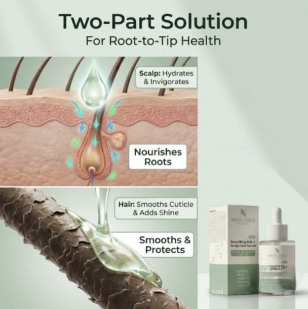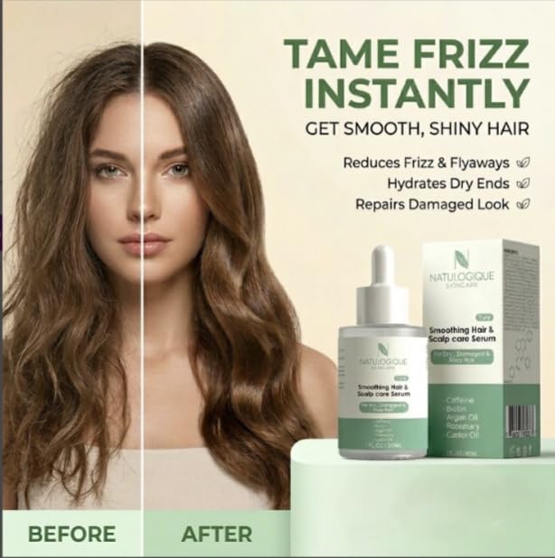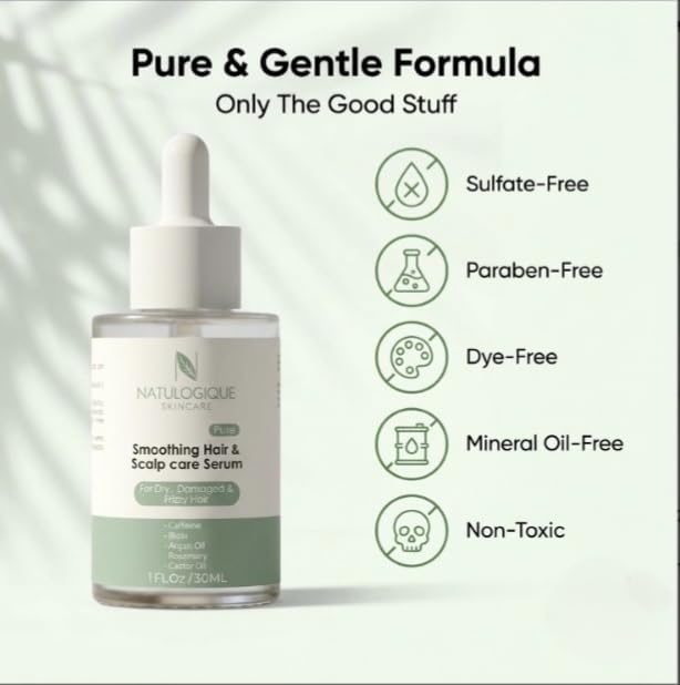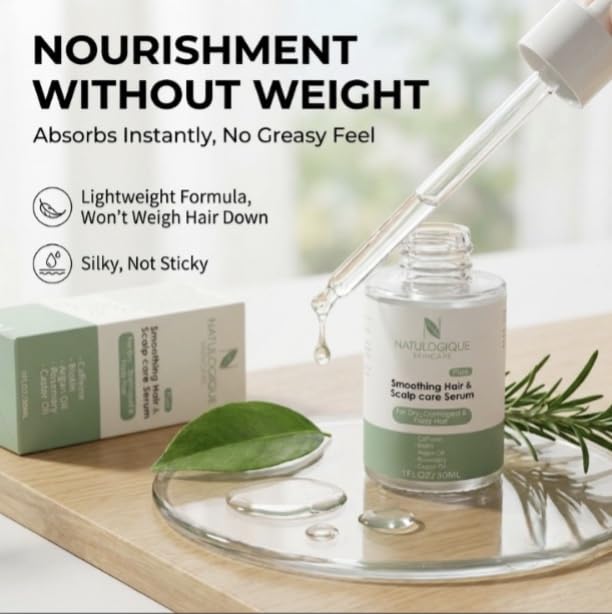 Transform your hair care routine with this innovative Smoothing Hair and Scalp Care Serum from Natulogique. Specially formulated for dry, damaged, and frizzy hair as well as scalp nurishment, this powerful serum combines caffeine to invigorate the scalp, biotin to strengthen strands, and argan oil for deep nourishment. The dual-action formula features rosemary, Hyaluronic Acid and vitamins for scalp health as well as aloe vera and castor oil for moisture retention, working together to reduce frizz while promoting health, shine and manageability. The lightweight serum penetrates deeply to smooth unruly strands and provide intense nourishment from root to tip. The precise dropper applicator ensures targeted application exactly where needed. Whether you're battling flyaways, dealing with damage, or seeking to restore your hair's natural vitality, this comprehensive treatment helps transform troubled tresses into smoother, more manageable hair. Perfect for daily use, this concentrated formula delivers visible results while being gentle enough for regular application. The convenient 1-ounce size makes it ideal for both home use and travel.