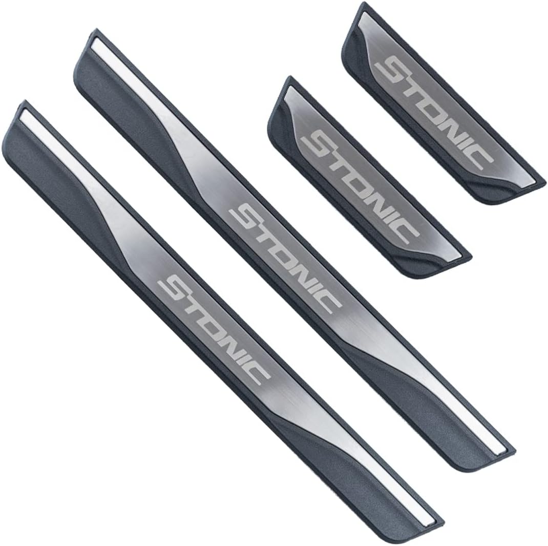 FEOYDS Stainless Steel All-Terrain Door Sill Guards are an additional protection against scratches and scuffs. These impact-resistant injection molded ABS plastic base won't hurt your car door paint, and the part of durable Stainless Steel guards featured the Stonic logo are designed to prevent wear & tear. They pass all production testing, including water immersion, cleanabilty, extreme temperatures, weathering, soiling, automotive fluids resistance, and scratch resistance. They do not interfere with door or door seal function. Set of four. Door Sill Guards help protect the lower door sills from scratches and scuffs. Available in brushed or chrome glossy stainless steel with plastic and feature the vehicle's logo. Fits 2017-2023 Kia Stonic.