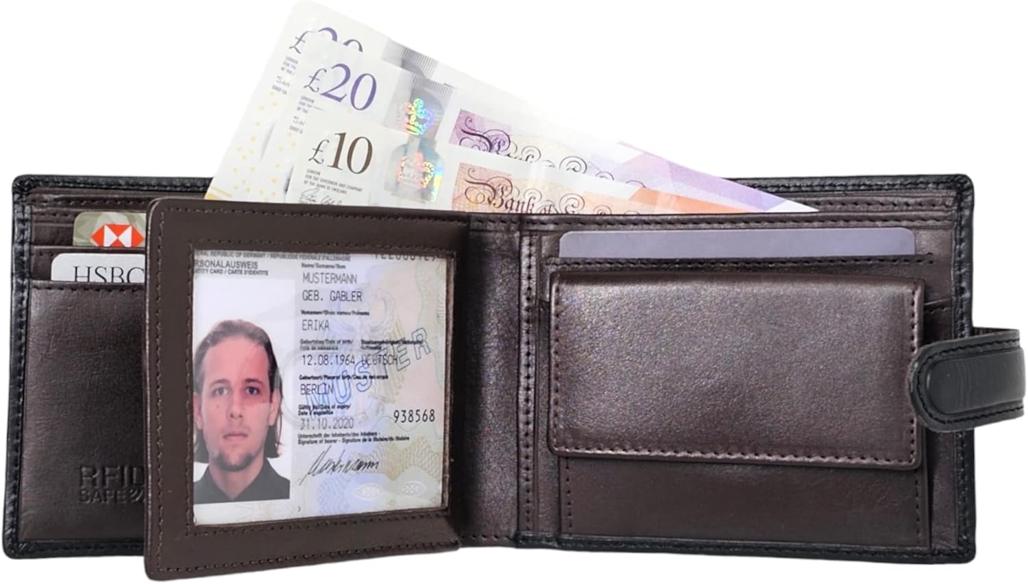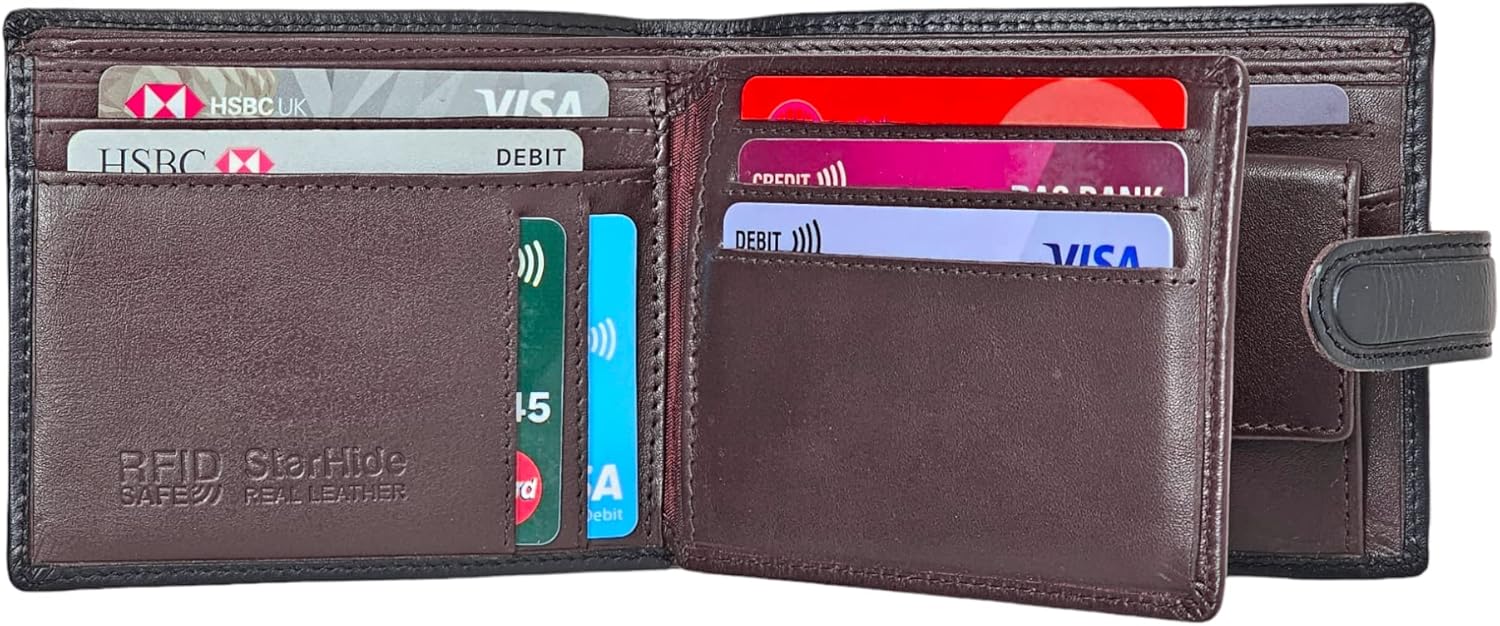 Mens new high quality soft luxury leather wallet in black,superb quality wallet with the following features :-,space for 8 debit / credit cards, clear pouch for id / driving licence,2 compartments for notes with full length zip,change pouch with press stud,3 further compartments,3 fold wallet with press stud closings,measures 95mm x 115mm closed