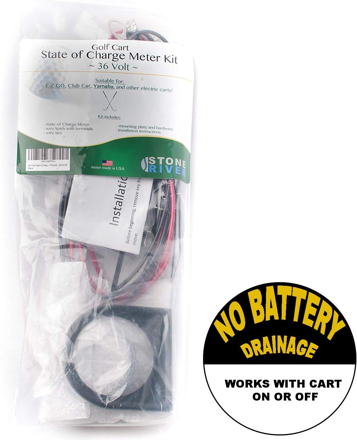 This state of charge meter is made to ensure high quality and performance. Meter fits into a 52 mm hole, which is the standard sized hole in most golf cart dashes. Meter has two blade connectors on rear to easily swap into your existing wiring harness. Meter comes with nuts, lock washers, and pressure clamp on rear to tightly fit into mounting hole. Meter does not draw power while in rest mode as digital or illuminated meters do. Please check with golf cart manufacturer for installation instructions specific to your cart. Red on the left - time to charge Green – Good but will need charging soon White – Fully charged Red on the right – over charged