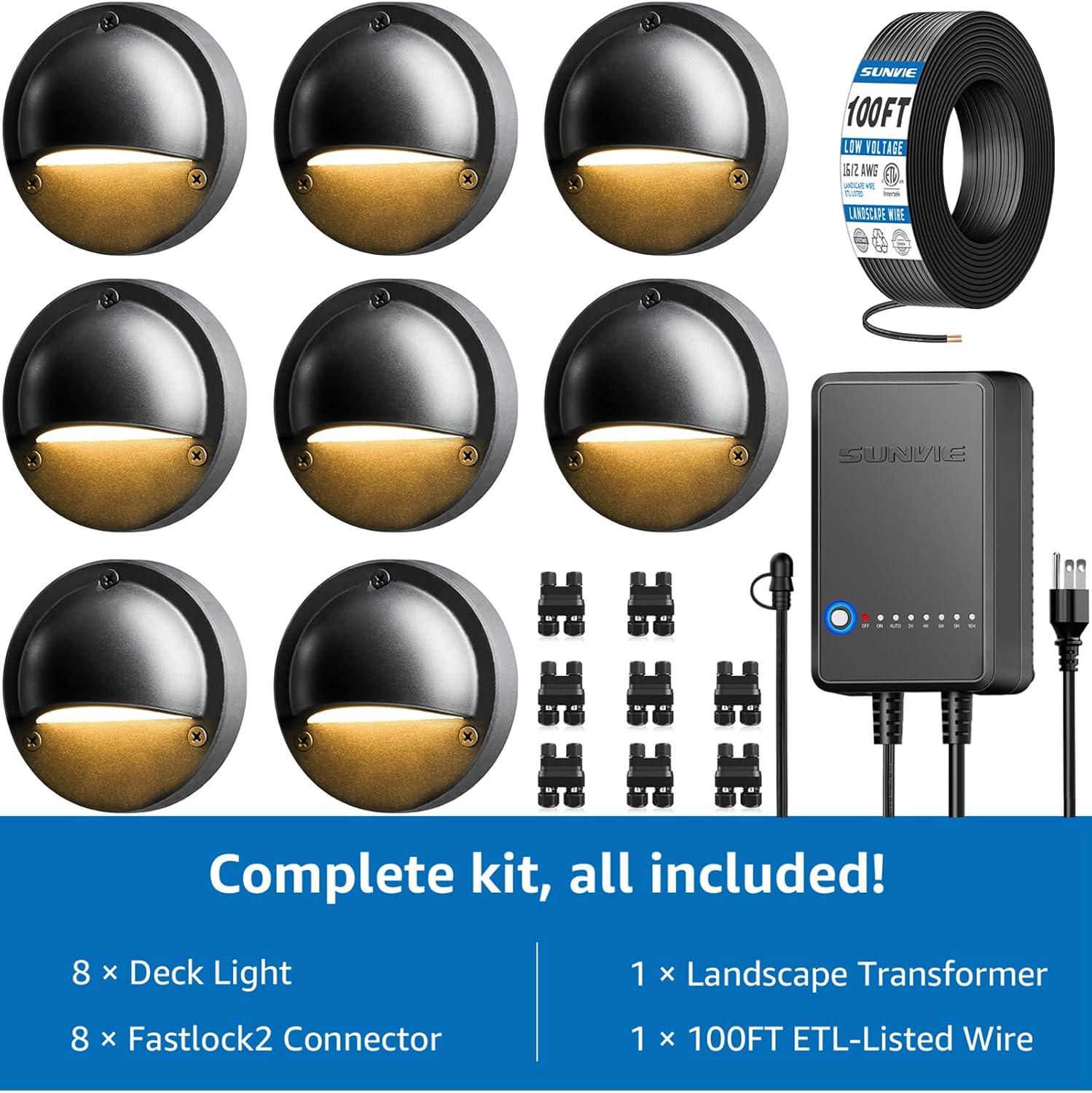 | Included Components | 1 × 100FT Landscape Wire, 1 × Transformer, 8 × Connector, 8 × Low Voltage Deck Lights, 8 × Mounting Template |