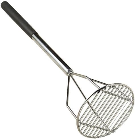 This round face potato masher is made of chrome plated metal. Comes with black texture handle. Round face on this model covers a large surface area, ensuring that potatoes will be mashed as quickly and efficiently as possible. Measures 24-inch length.